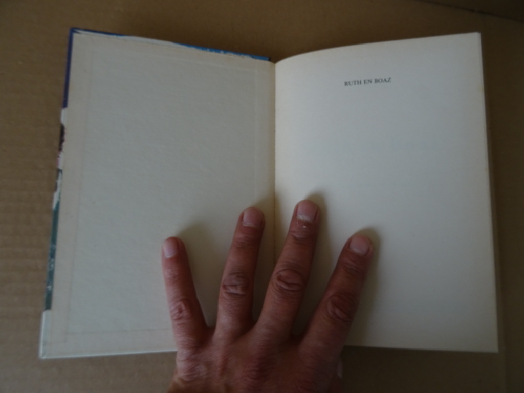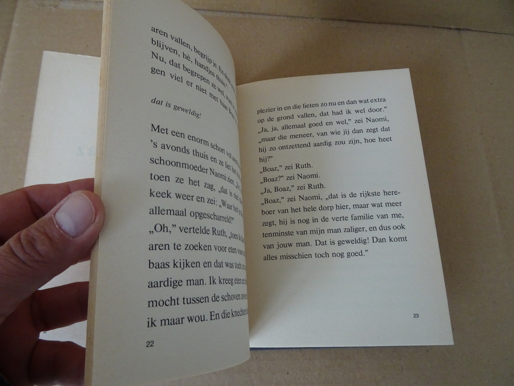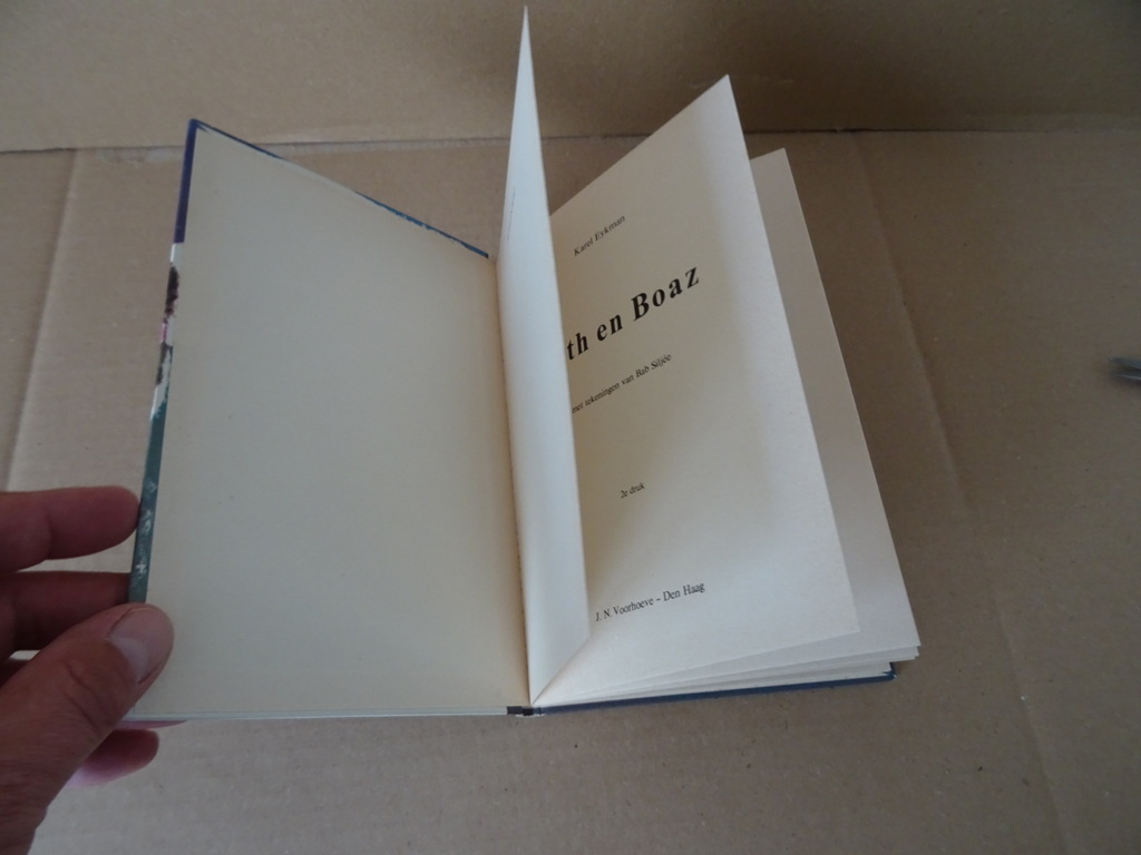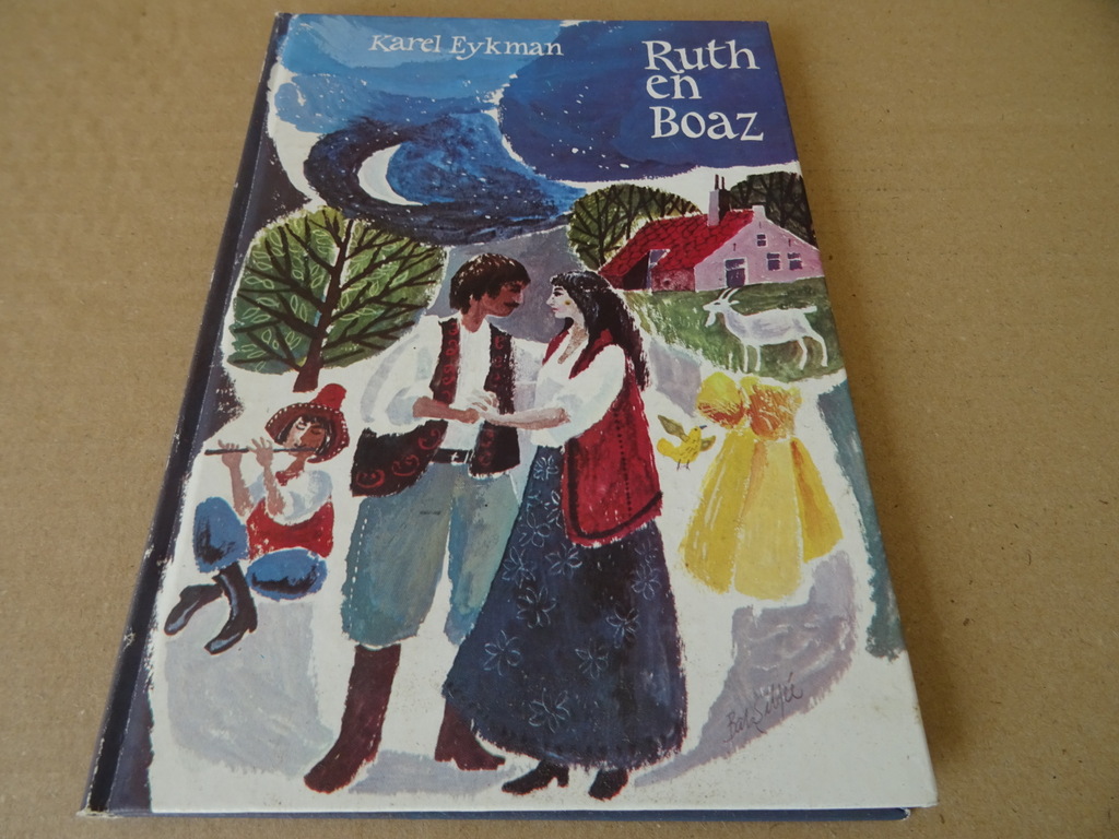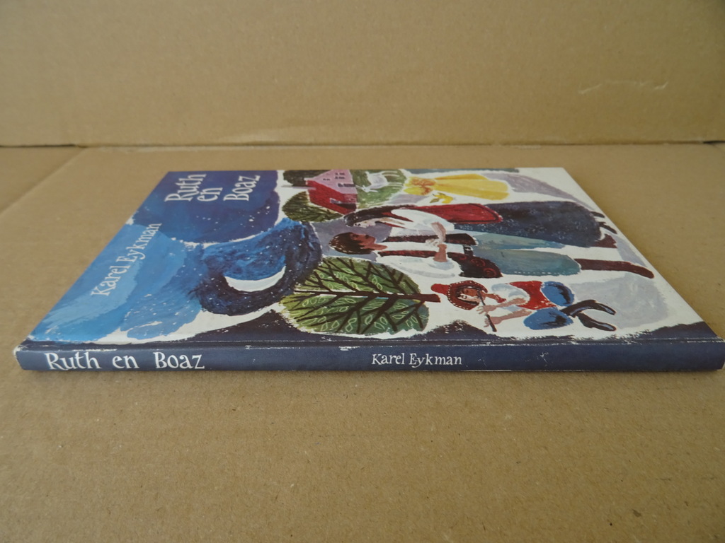 Karel Eykman Ruth en Boaz met tekeningen van Bab Siljée, tweede druk zonder jaartal. Het zal circa 1973 zijn. Afkomstig uit de collectie van een pastoor op leeftijd. In goede gebruikte staat, aan de zijkanten wat bevlekt, zie foto’s. Van binnen geen vlekjes en nog vrij mooi, haast als nieuw, lijkt ongelezen. 44 pagina’s. Zeldzaam boekje, u vindt het alleen bij ons te koop. Gedrukt in een wat groter lettertype. Het verhaal over Ruth dat voorkomt in het Oude Testament, is naverteld in de taal van deze tijd met daarbij passende tekeningen. Karel Eykman oftewel Karel Eduard Eykman was een Nederlandse schrijver van kinderboeken, dichter en liedjesschrijver. Hij paste het verhaal aan voor kinderen.