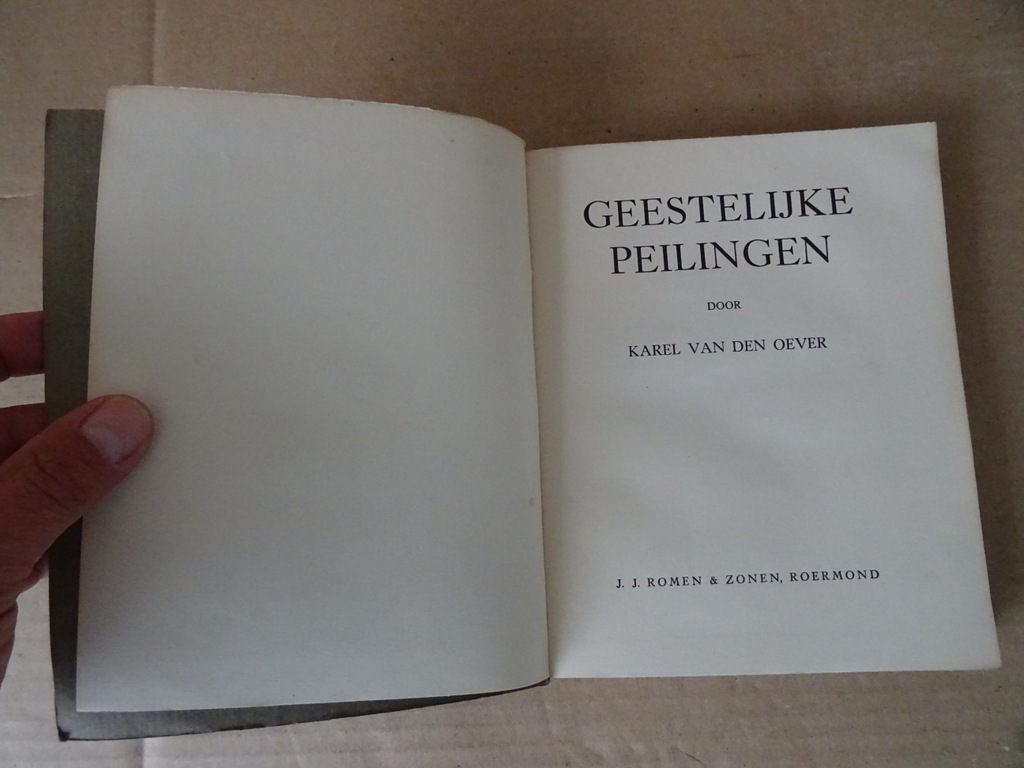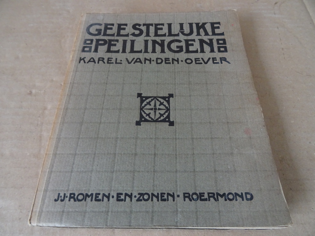 Karel van den Oever Geestelijke peilingen, eerste druk, zonder jaartal. Het zal circa 1924 zijn. Afkomstig uit de collectie van een pastoor op leeftijd. In goede gebruikte staat, voorin begint de kaft wat los te gaan, zie foto’s. Binnenin nog redelijk mooi. Lijkt ongelezen of haast ongelezen. 189 pagina’s.