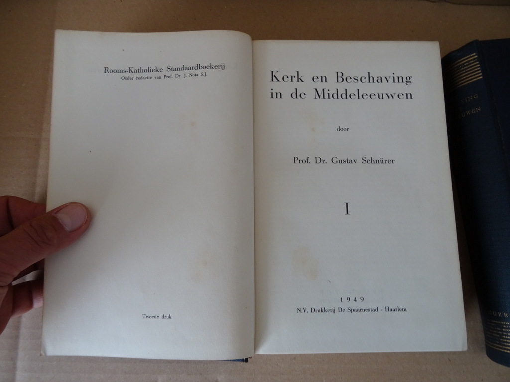 Kerk en Beschaving in de Middeleeuwen door Prof. Dr. Gustav Schnürer, deel I en II, tweede druk uit 1949. De boeken zijn in goede gebruikte staat, gelezen maar van binnen nog vrij mooi. Slechts voorin en achterin wat vochtplekjes, in de boeken zelf niet. 467 en 613 pagina’s. Afkomstig uit de collectie van een pastoor op leeftijd.