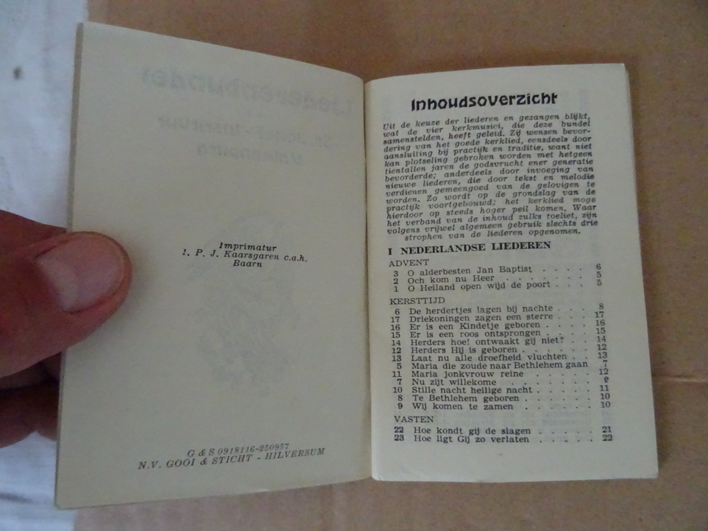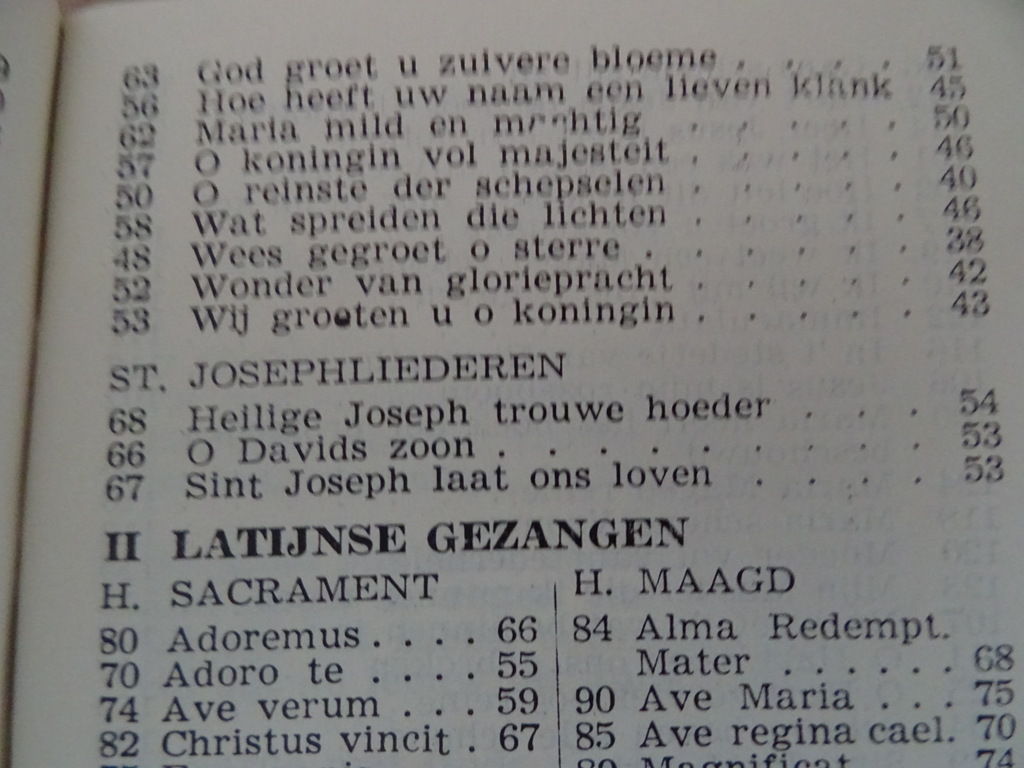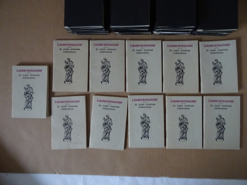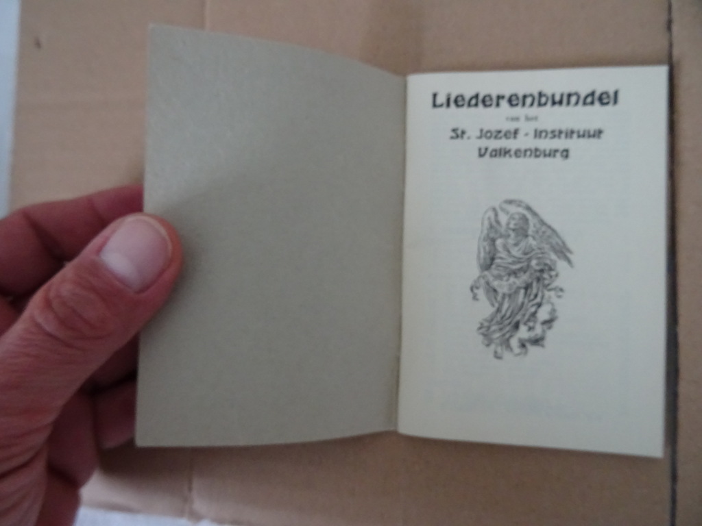 Liederenbundel van het St. Jozef Instituut Valkenburg, mogelijk 1e druk uit 1950 of iets later. Prachtig boekje in zakformaat gevuld met 131 religieuze liederen in het Nederlands. 126 pagina’s. In nog vrij goede staat, lijkt ongelezen of haast ongelezen. Minstens 50 exemplaren op voorraad, de meeste in nog vrij goede staat, (haast) ongelezen. Een aantal is gekaft met zwart papier, zie laatste foto’s. 9 euro per stuk, korting bij meerdere exemplaren. Doe gerust een bod op alle boekjes. Dit boekje is nergens anders verkrijgbaar!
