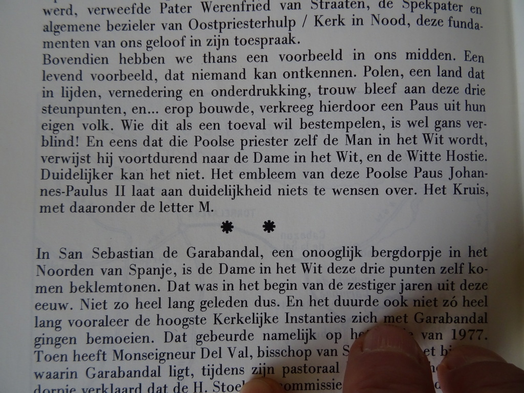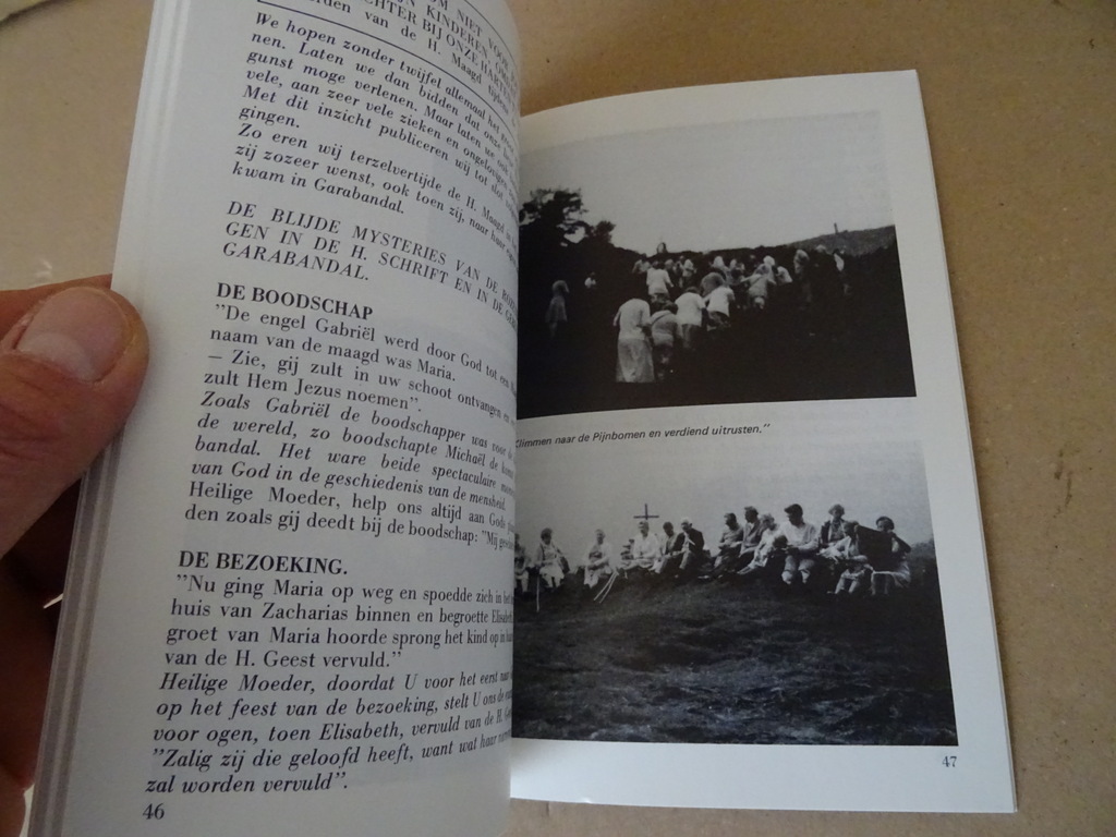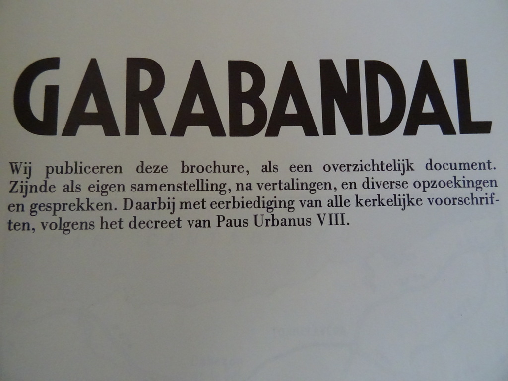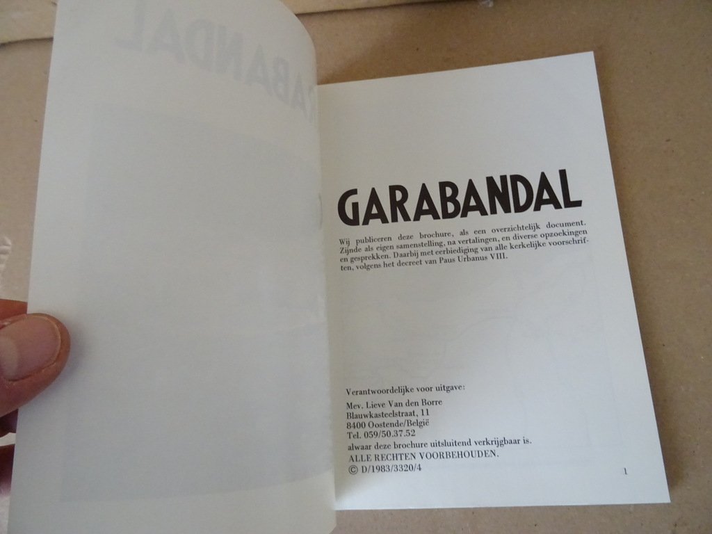 Lieve van den Borre Garabandal, eerste druk uit 1983. Afkomstig uit de collectie van een pastoor op leeftijd. In goede gebruikte staat, van buiten enkele vlekjes, zie foto’s. Van binnen nog mooi, lijkt ongelezen. 56 pagina’s.