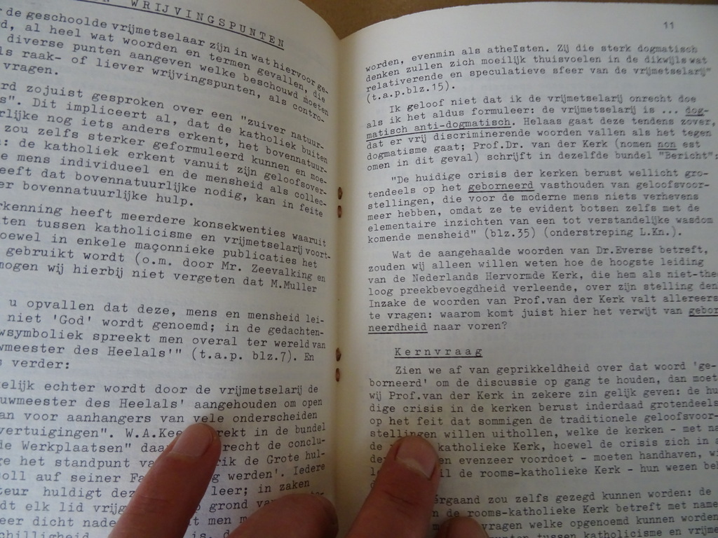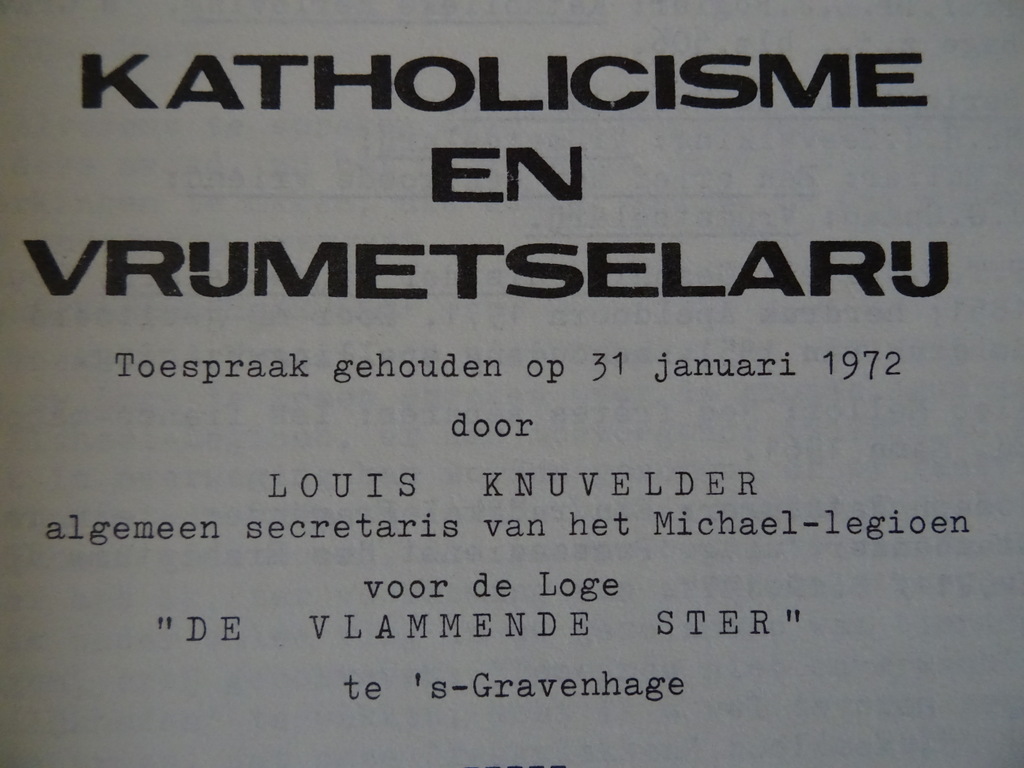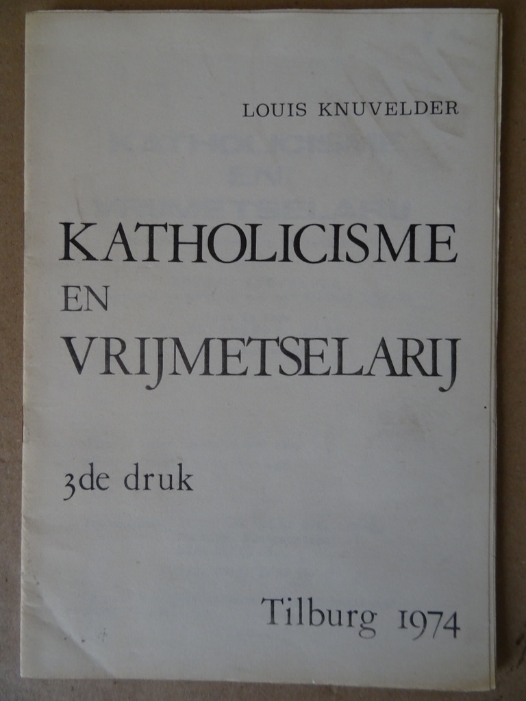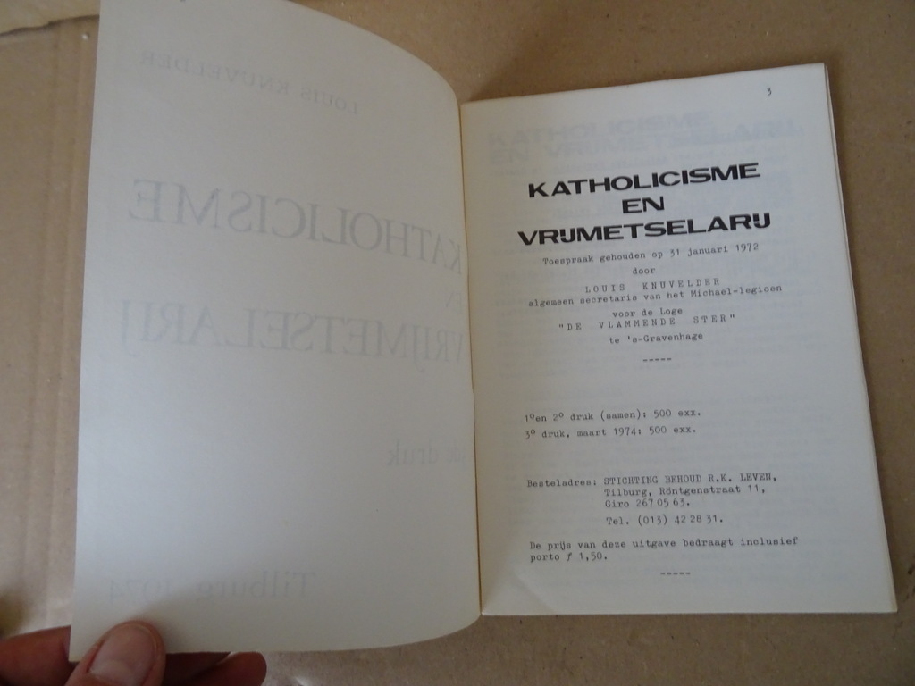 Louis Knuvelder Katholicisme en vrijmetselarij, derde druk uit 1974. In goede gebruikte staat, zie foto’s. Van binnen nog mooi, lijkt ongelezen of haast ongelezen. 19 pagina’s. Afkomstig uit de collectie van een pastoor op leeftijd. Zeldzaam. Bekijk ook de andere boeken over vrijmetselarij, onder andere nog een boekje van dezelfde schrijver.