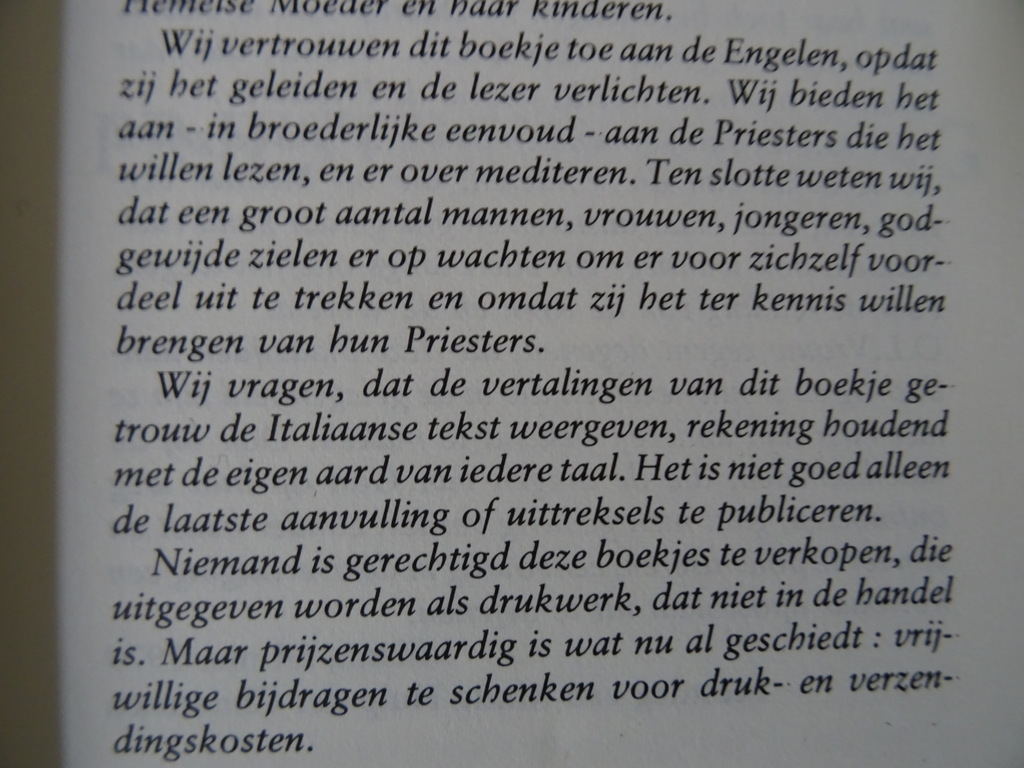 O.L. Vrouw Aan de priesters haar zeer geliefde Zonen, eerste Nederlandse druk uit 1979. Pro manuscripto ten gebruike van de Mariale Priesterbeweging. Afkomstig uit de collectie van een pastoor op leeftijd. In een prachtige gebruikte staat, lijkt ongelezen. 382 Pagina’s.