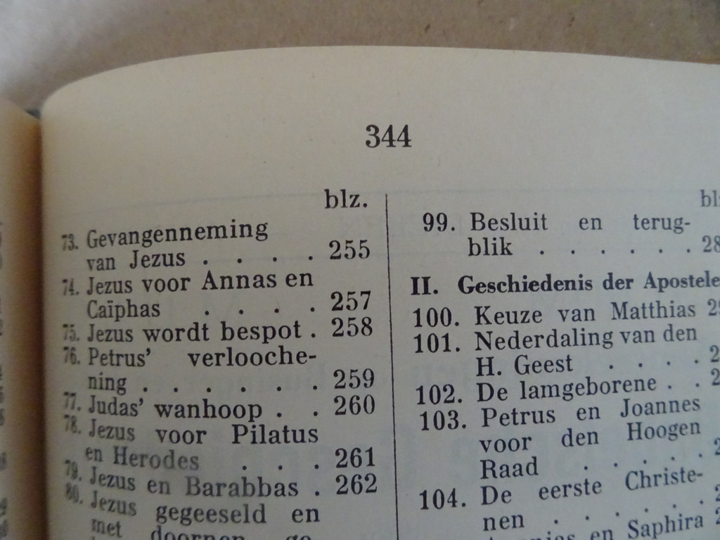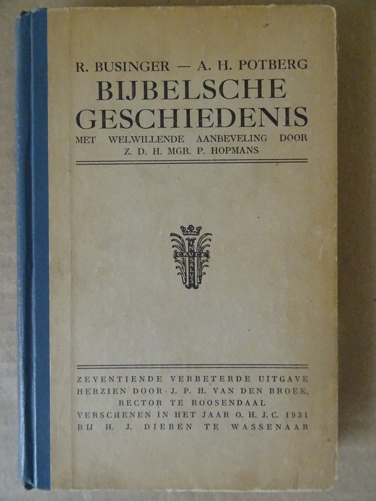 R. Businger A. H. Potberg Bijbelsche Geschiedenis met welwillende aanbeveling door Z. D. H. MGR. P. Hopmans, zeventiende verbeterde druk uit 1931. In een prachtige gebruikte staat, lichte slijtage aan zijkant kaft, zie foto’s. Van binnen nog mooi, lijkt ongelezen of haast ongelezen. Verrijkt met fraaie prenten in zwart wit. 344 pagina’s. Afkomstig uit de bibliotheek van een pastoor op leeftijd.