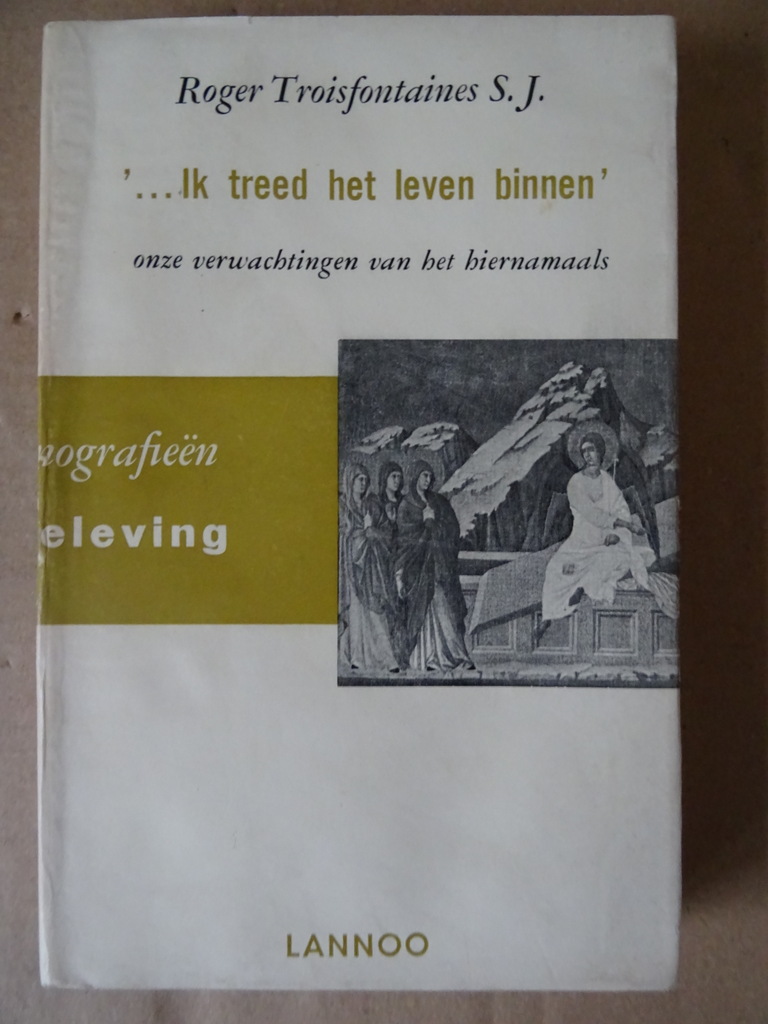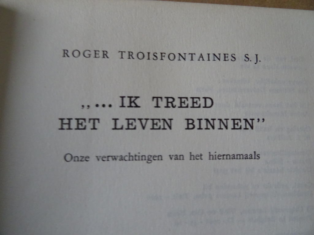 Roger Troisfontaines S.J. Ik treed het leven binnen, onze verwachtingen van het hiernamaals, eerste Nederlandse druk uit 1966. In schitterende gebruikte staat, zie foto’s. Van binnen nog mooi, lijkt ongelezen. 241 pagina’s.
