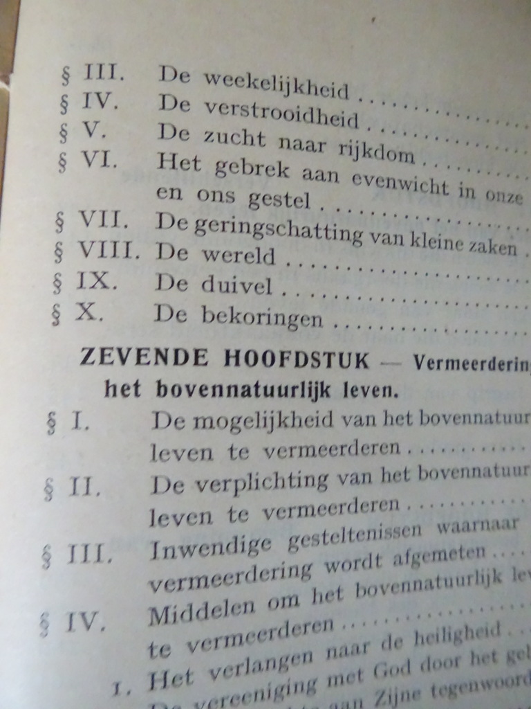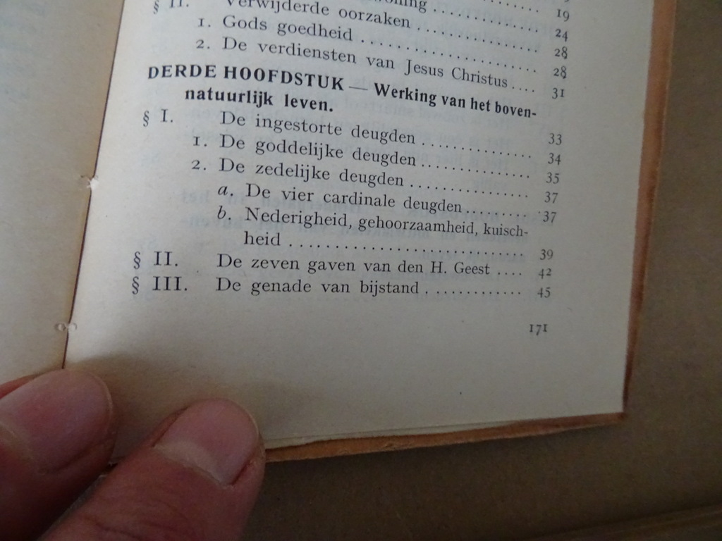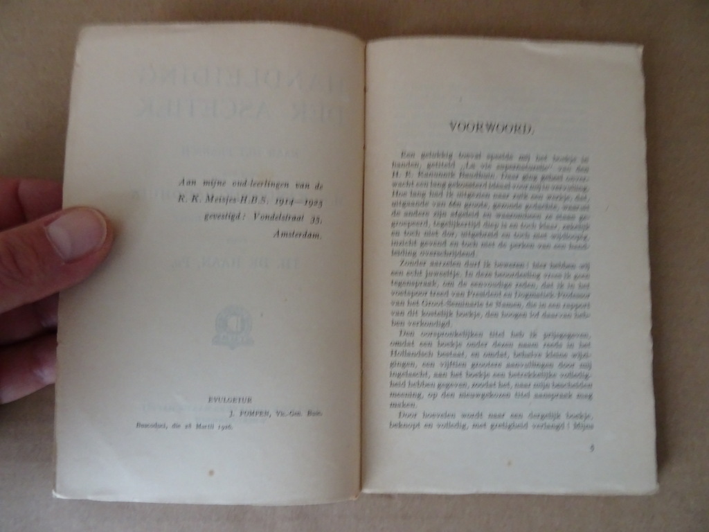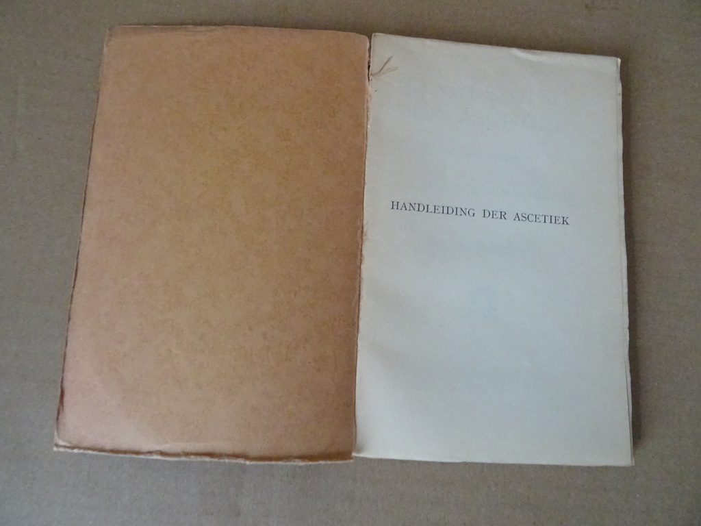 TH. de Haan Handleiding der Ascetiek naar het Fransch van den H.E. Kanunnik Baudhuin vertaald en bewerkt door TH. de Haan, Pr., eerste druk uit 1926. 174 Pagina’s. Zeldzaam boekje. Afkomstig uit de collectie van een pastoor op leeftijd. In een prachtige gebruikte staat, met wat kleine vouwtjes maar ongelezen. De kaft begint wat los te gaan door de ouderdom. De meeste bladzijdes zijn nog aan elkaar bevestigd aan de bovenkant. Bij pagina 13 en 15 is dit aan de rechterkant. Bij pagina 17 tot en met 168 is het aan de bovenkant. Ze dienen voorzichtig opengesneden te worden met een briefopener of mes.