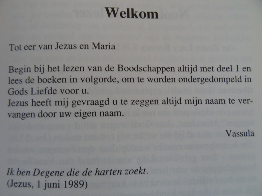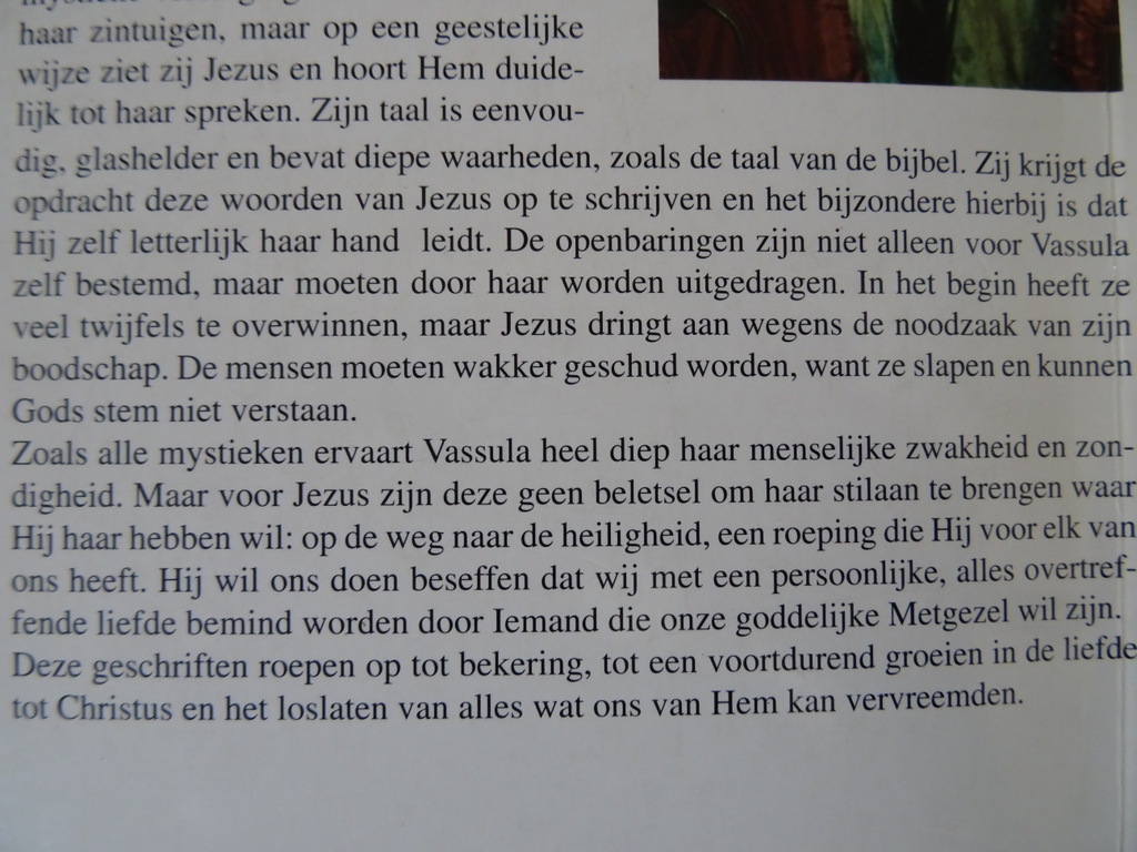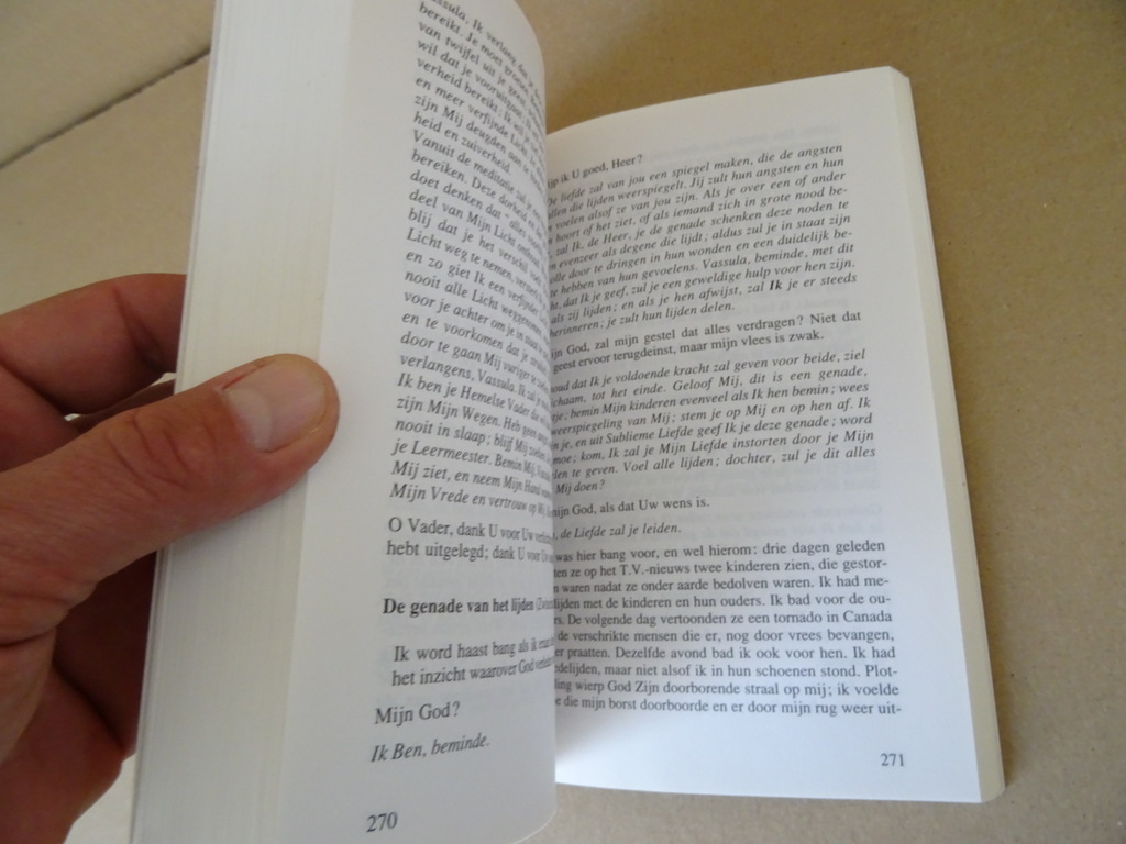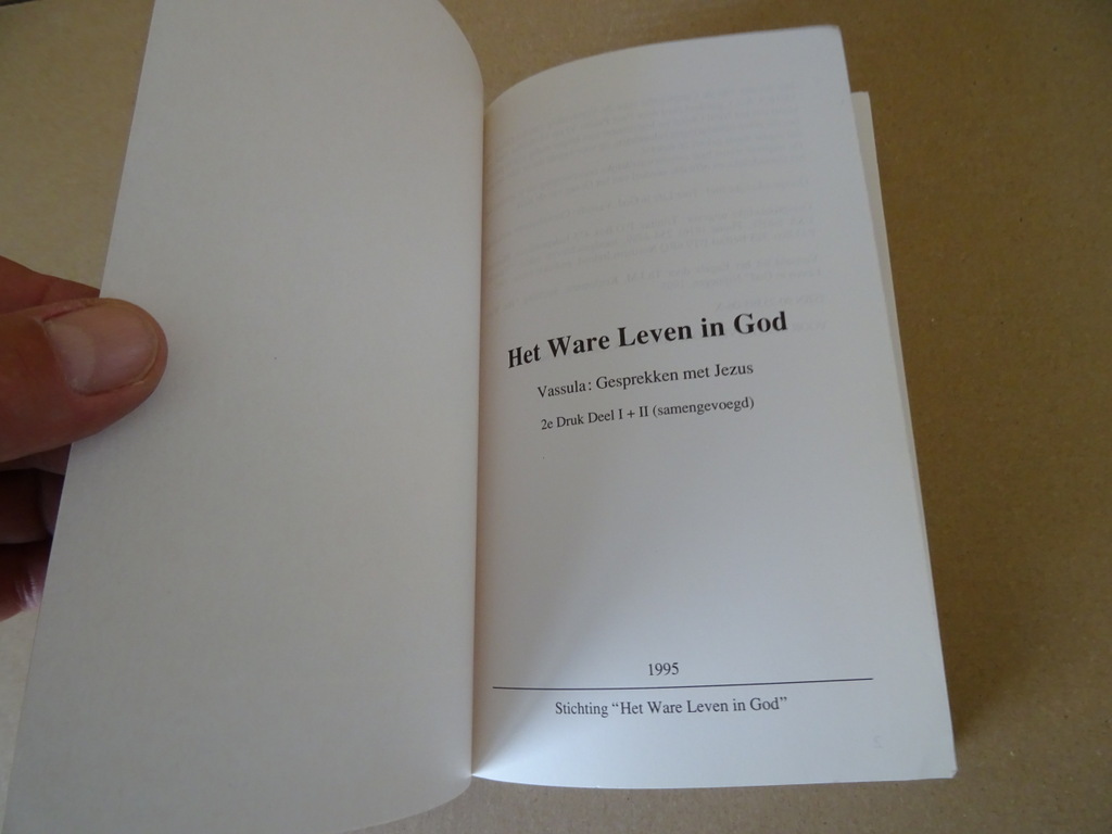 Vassula gesprekken met Jezus deel I-II oftewel Vasula; gesprekken met Jezus tweede druk deel I + II (samengevoegd) uit 1995. Uitgegeven door Stichting “Het ware leven in God”. In goede gebruikte staat, zie foto’s. Van binnen nog mooi, lijkt ongelezen. 370 pagina’s. Afkomstig uit de collectie van een pastoor op leeftijd.