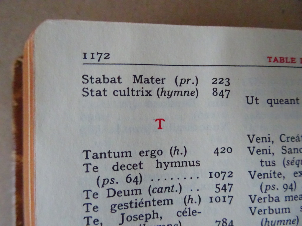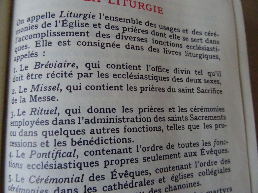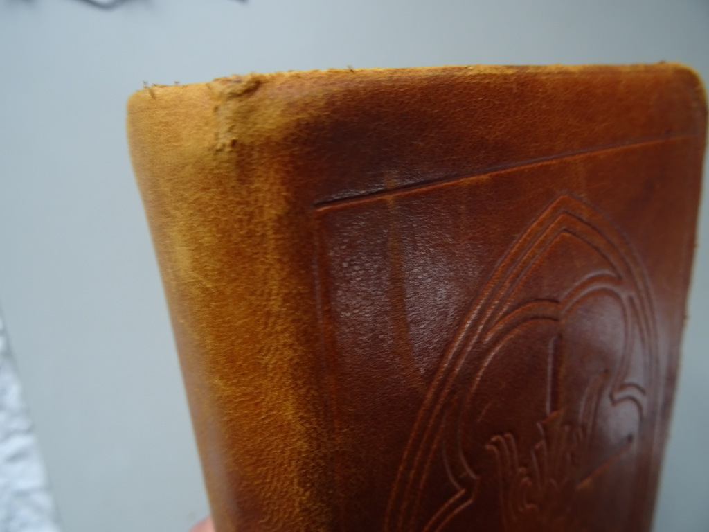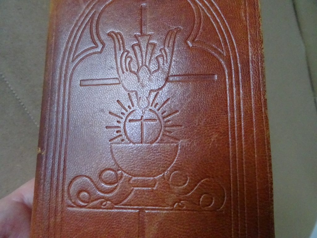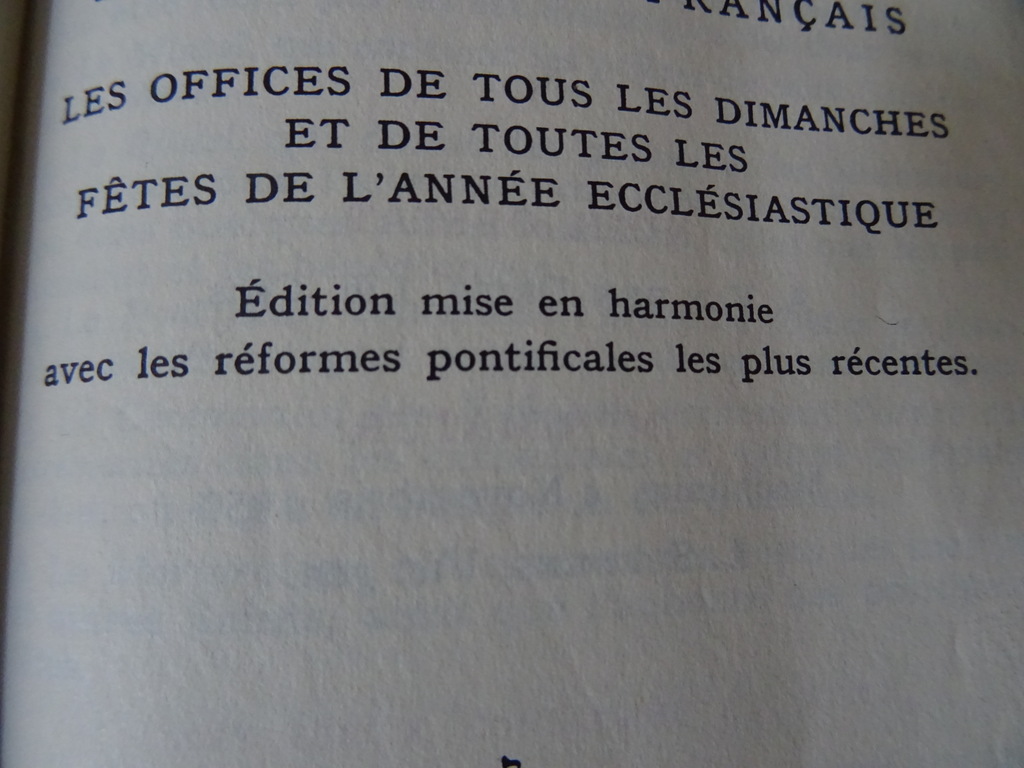 Verguld Frans missaal Missel vespéral par l’Abbé E. Bourceau contenant en Latin et en Français, les offices du dimanches et toutes les fêtes de l’année ecclésiastique, Édition mise en harmonie avec les réformes pontificales les plus récentes, No 238, latere druk uit 1959. Met teksten in het Latijns en Frans. Afkomstig uit de collectie van een pastoor op leeftijd. 1172 + 132 pagina’s. Dankzij het lederen foedraal is het boek in nog zeer goede staat en is de vergulde decoratie ook nog heel mooi. Het lijkt ongelezen of haast ongelezen. Afmetingen boek circa 9,5 bij 15,3 bij 3,7 cm. Afmetingen foedraal circa 10 bij 17 bij 4,2 cm.