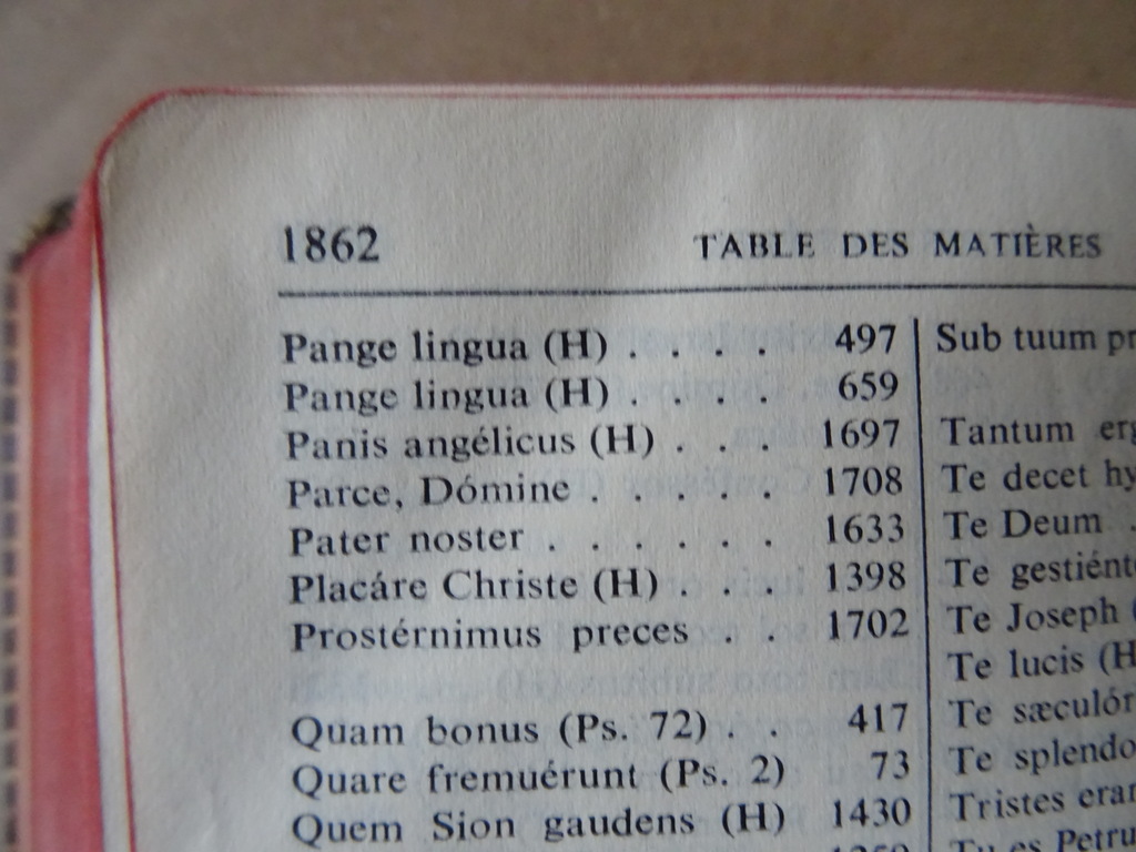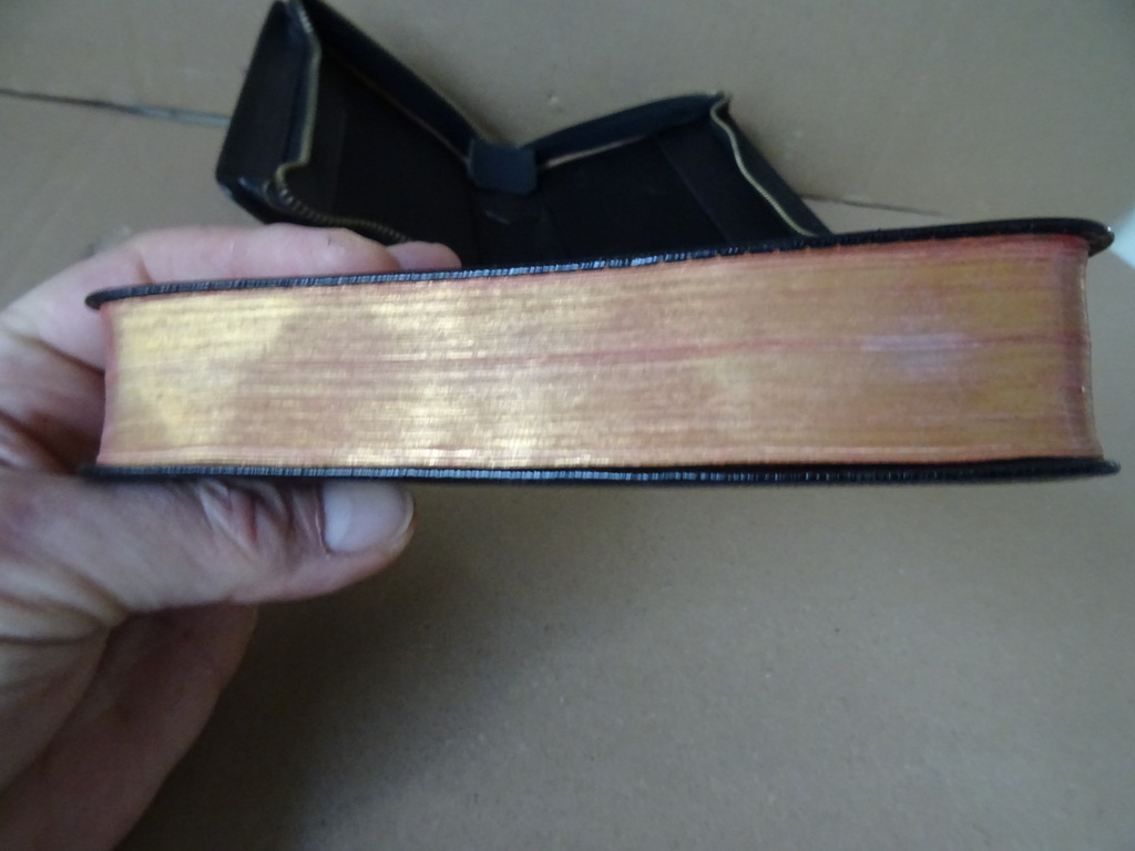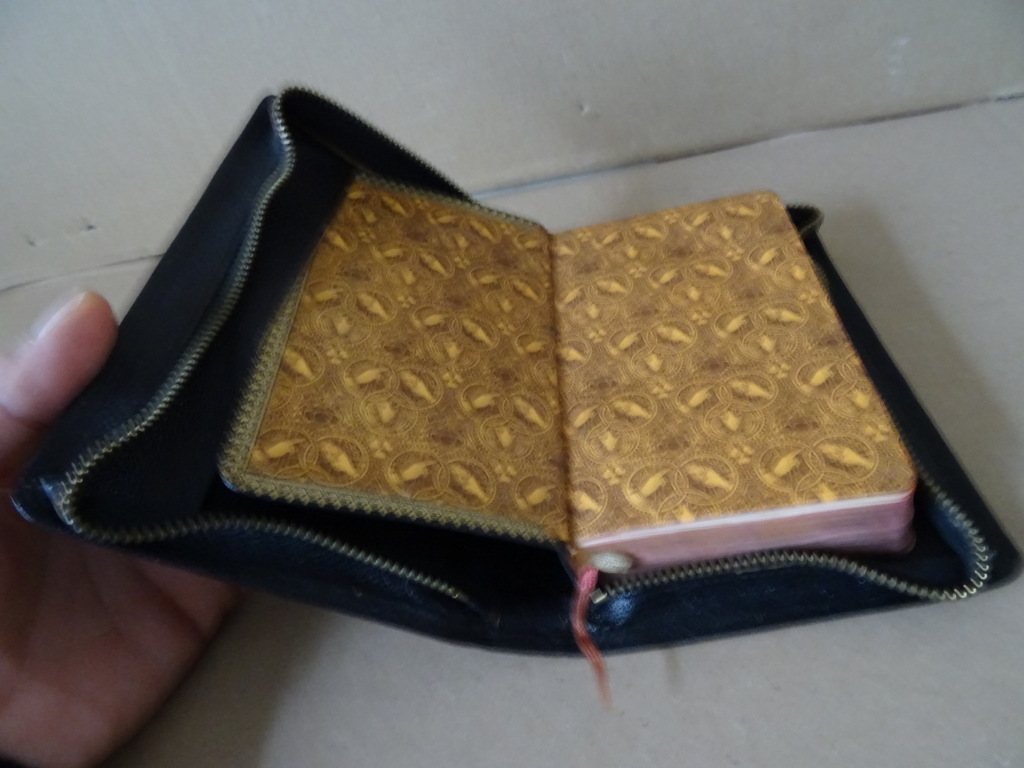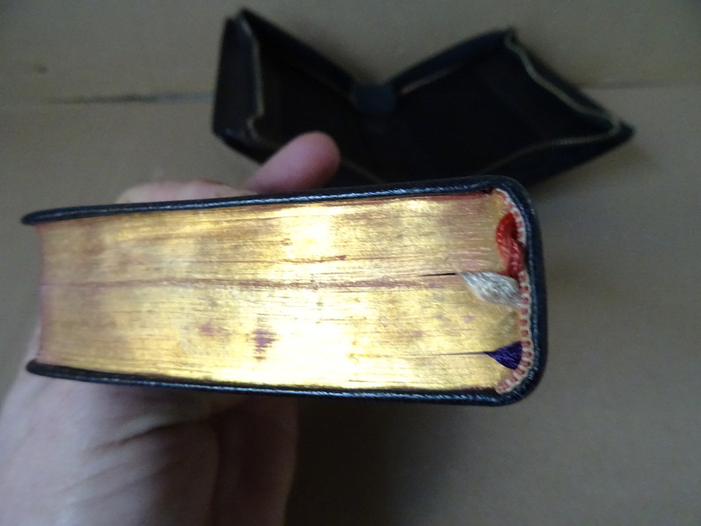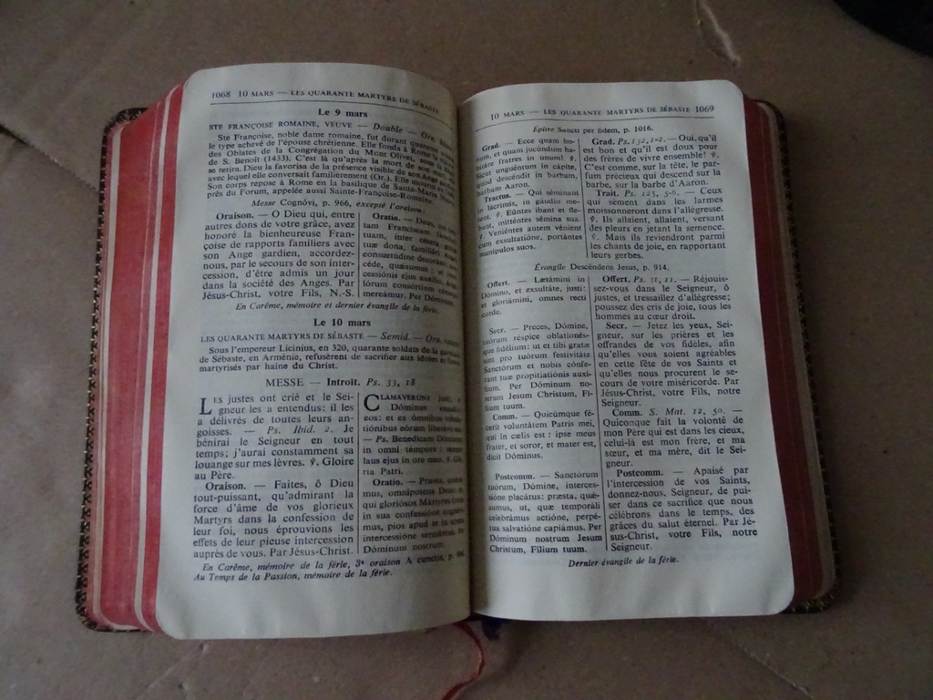Verguld Frans missaal Missel vespéral Romain (quotidien) par Dom Gaspar Lefebvre, bénédictin de L’abbaye de St André, Texte en latin avec la traduction en regard par le chanoine E. Osty, latere druk uit 1951. No 500-2. Met teksten in het Latijns en Frans. Afkomstig uit de collectie van een pastoor op leeftijd. In nog vrij goede staat, gelezen, van binnen redelijk net. 1862 pagina’s. Dankzij het lederen foedraal is het boek in nog vrij goede staat en is de vergulde decoratie ook nog mooi. Afmetingen boek circa 9,3 bij 15,5 bij 3,2 cm. Afmetingen foedraal circa 12 bij 17,5 bij 4 cm.