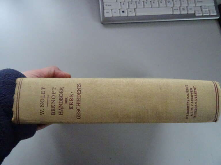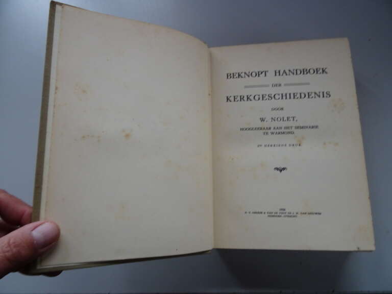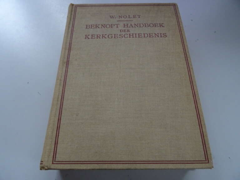 W. Nolet Beknopt handboek der kerkgeschiedenis, tweede herziene druk uit 1926. Afkomstig uit de collectie van een pastoor op leeftijd. In goede gebruikte staat, wat bevlekt, zie foto’s. Van binnen nog redelijk mooi, af en toe wat vlekjes aan de zijkanten, lijkt weinig gelezen. Wel zijn er aantekeningen door de pastoor gemaakt met potlood. 457 pagina’s.