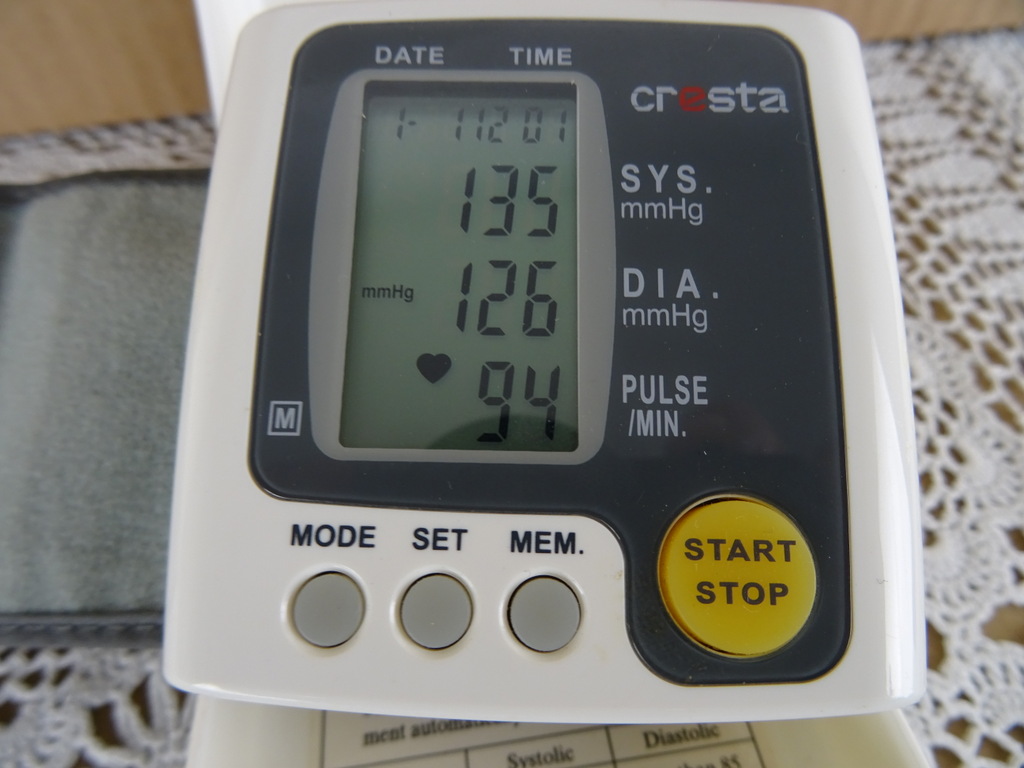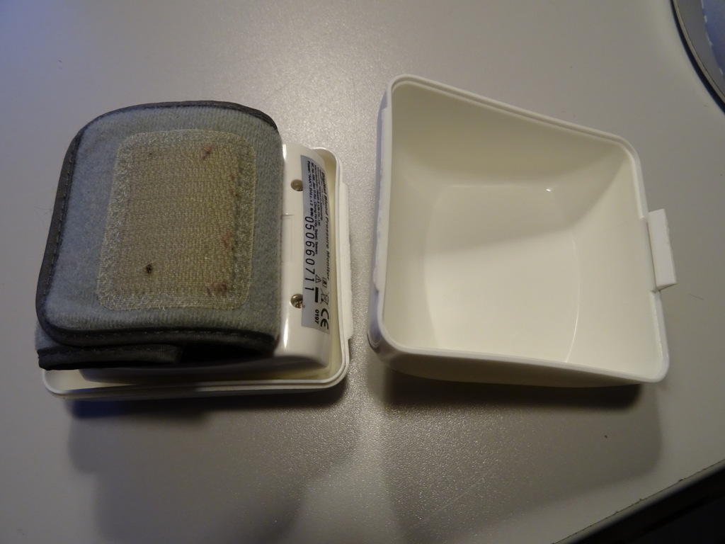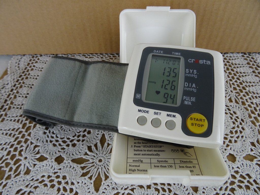 Cresta bloeddrukmeter pols vervaardigd rond 1990 of later. Nog in vrij goede staat en werkend. Voorzien van nieuwe batterijen. Het doosje in gebruikte staat, toen ik het net weer opende liet de deksel los, zie laatste foto. Het doosje sluit nu niet meer.
