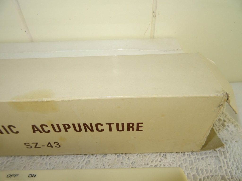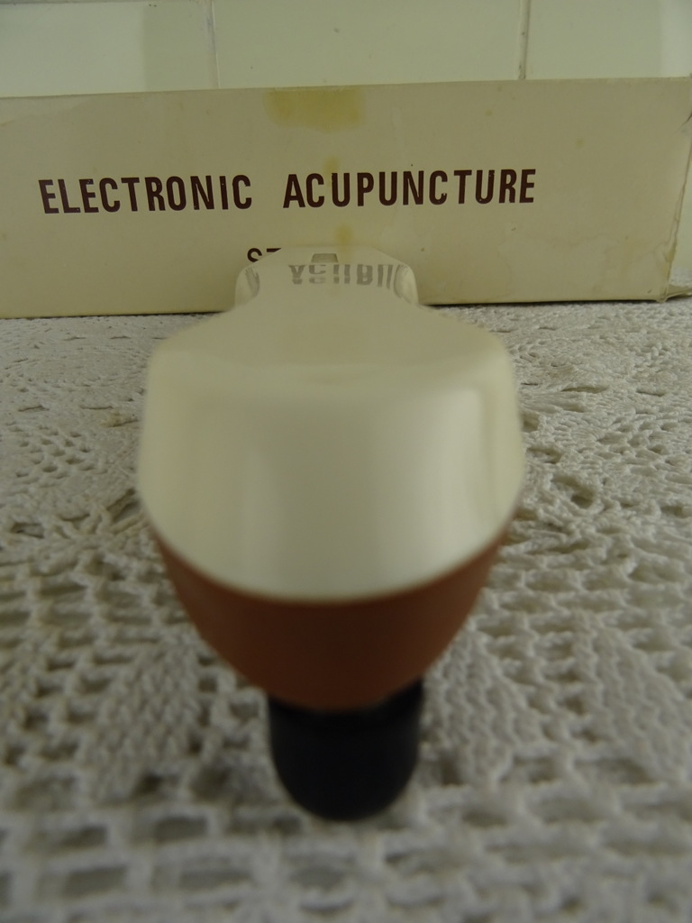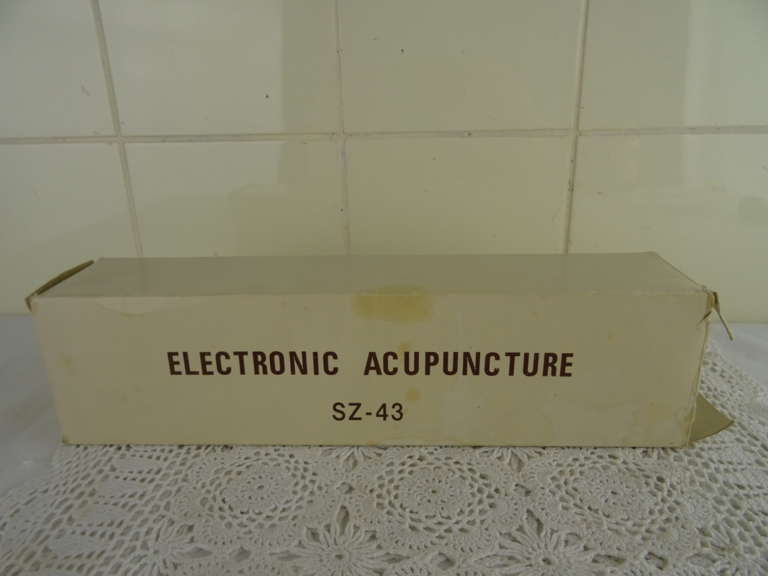 Vintage acupunctuur apparaat vervaardigd rond 1970. Het kon (en kan) gebruikt worden om jezelf te behandelen met acupunctuur. Het apparaat zit nog in de originele doos en is nog in vrij goede staat, de doos in redelijke staat. Wel is er een stukje van het klepje afgebroken toen ik het opende. Het blijft wel nog redelijk goed vastzitten. Toen ik er een nieuwe batterij indeed en het apparaat op mijn arm drukte voelde ik dat het nog werkt. De afmetingen zijn 3.8 bij 2.8 bij 22.5 cm.