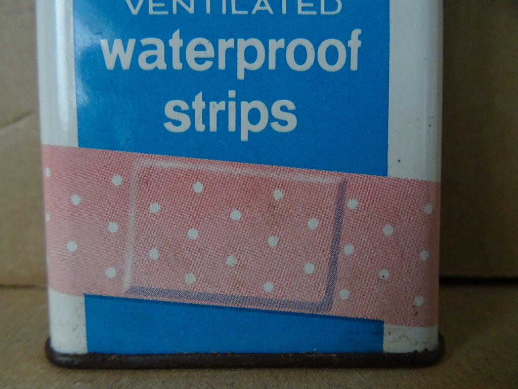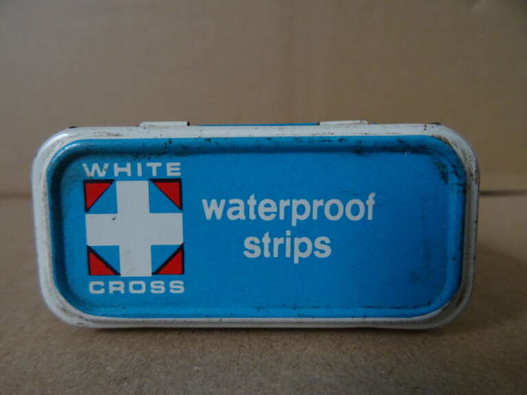 Vintage American White Cross ventilated waterproof strips vervaardigd rond 1950 of enkele jaren later. Het blikken doosje is in een schitterende gebruikte staat. Er is slechts wat lichte verkleuring, een minuscuul deukje en wat verkleuring aan de onderkant, zie foto’s. Het blikje is zelfs nog gevuld met 15 originele pleisters.