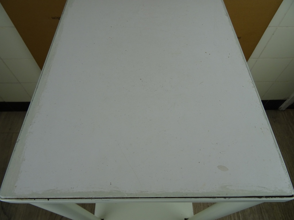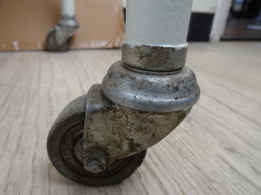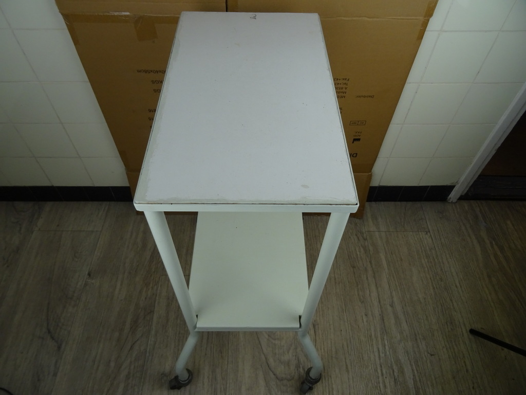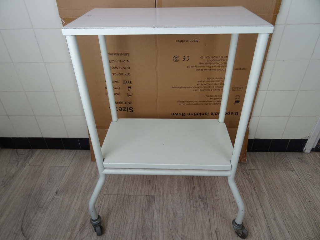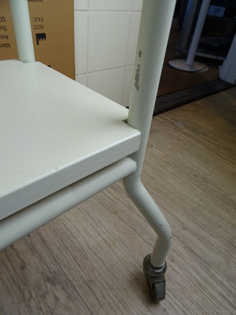 Vintage operatie trolley uit ziekenhuis, tandartspraktijk of huisartsenpraktijk vervaardigd rond 1950 of iets later. Een object als dit kom je niet snel tegen. De fraaie industriële trolley is in goede gebruikte staat, zie foto’s. Hij is oersterk, heeft alleen een likje verf nodig. De wielen draaien nog perfect. Er liggen twee houten planken in, zie foto’s. De trolley weegt 8.9 Kg, ingepakt circa 15 Kg. Verzending is alleen mogelijk binnen Nederland. Bezorging in de gehele Benelux is ook mogelijk, na overleg en bijbetaling.