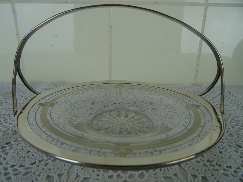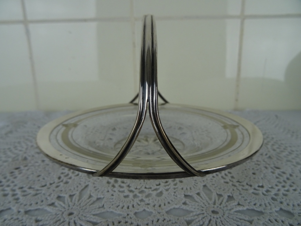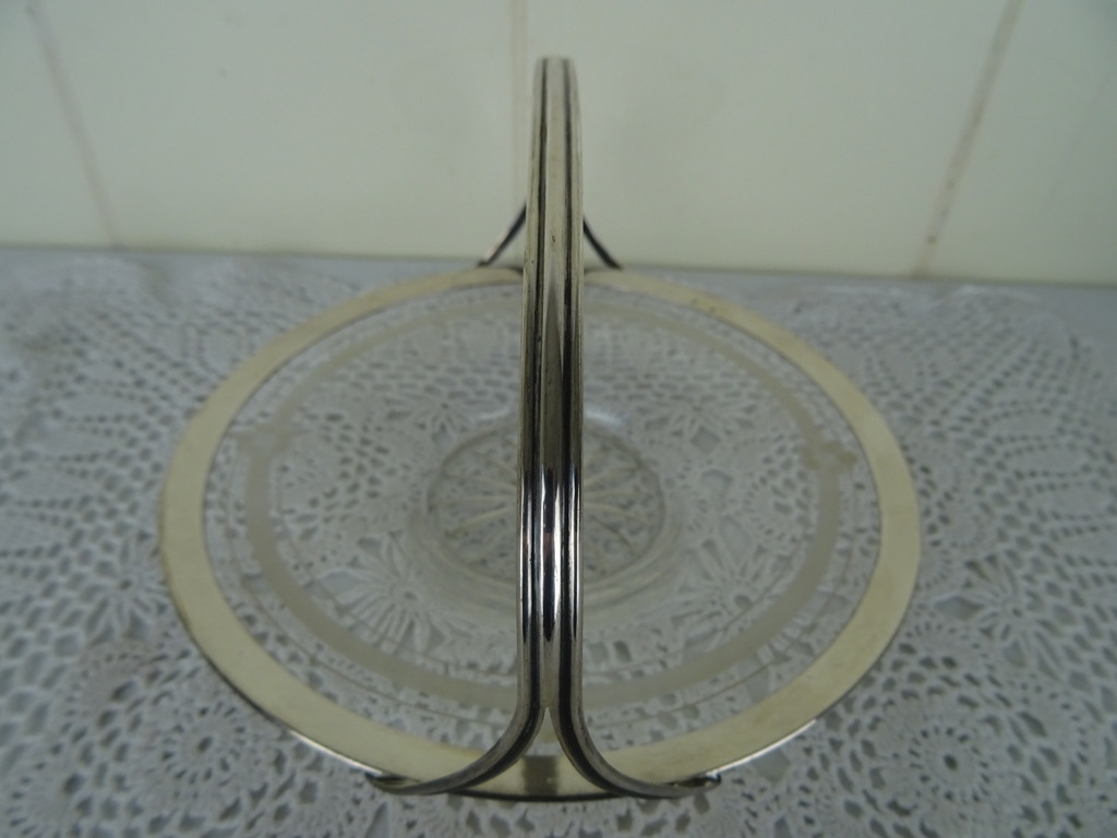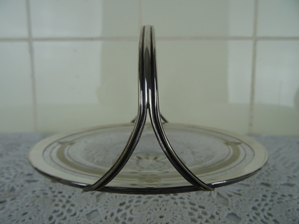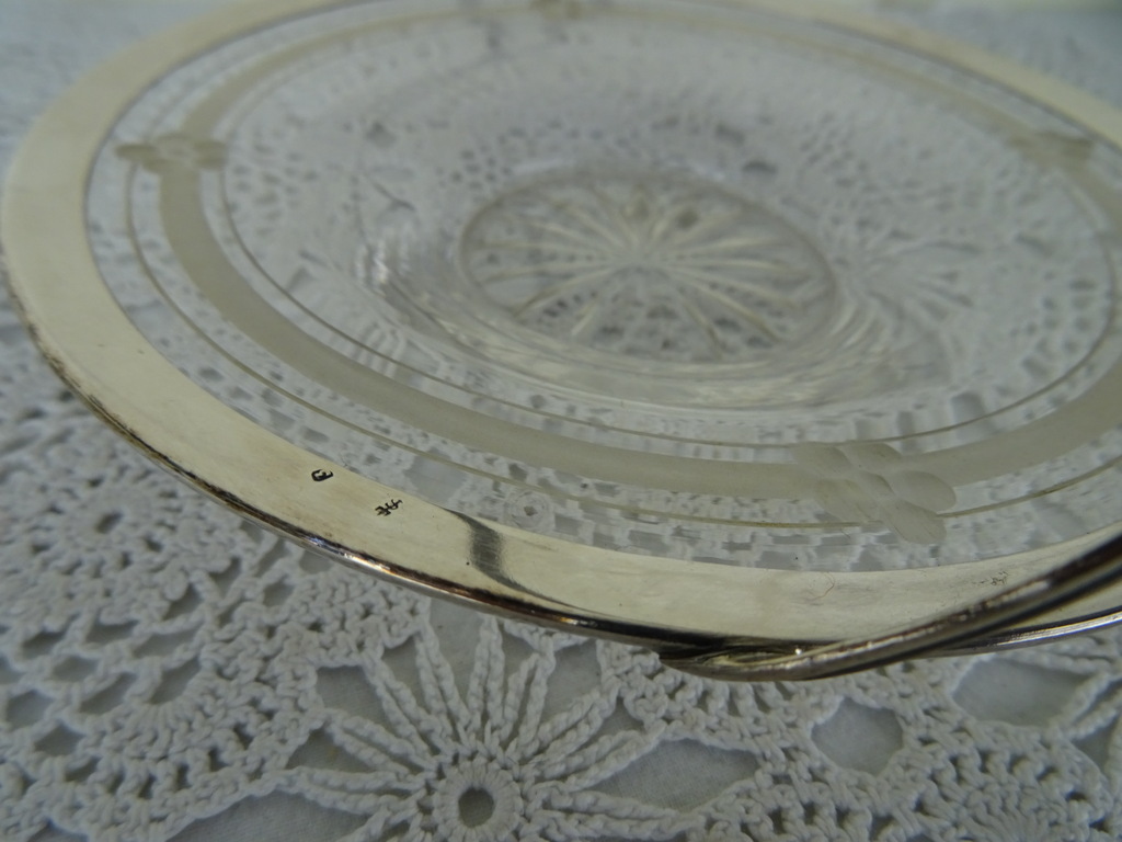 Fraai zilveren bonbonschaaltje vervaardigd rond 1950. Het fraaie schaaltje heeft een bodem van gedecoreerd glas. Het is verrijkt met een elegant zilveren handvat en ook de rand is van zilver. Het heeft gediend als schaaltje voor bonbons of snuisterijen. Het object is in een prachtige gebruikte staat, slechts licht bekrast; zie foto’s.