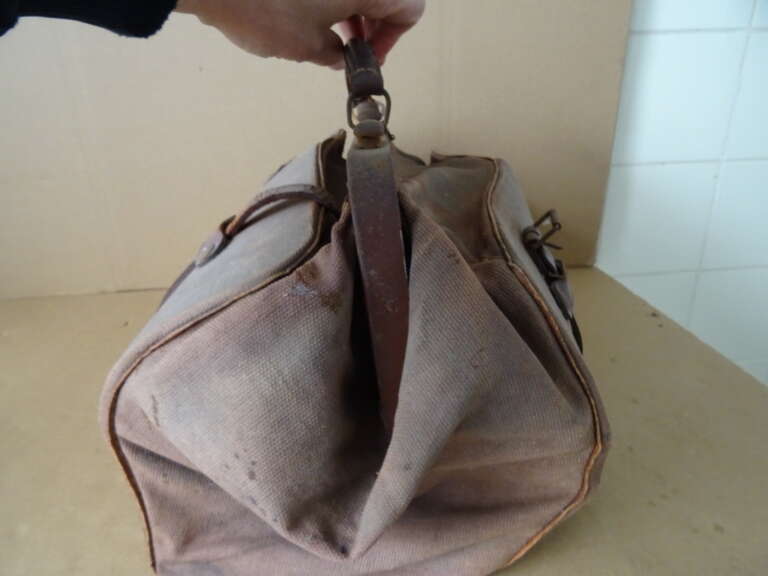 Antieke dokterstas vervaardigd rond 1920 of iets later. De fraaie tas is redelijke gebruikte, wat verweerde staat. Ze sluit nog goed maar de leren riempjes zijn in de loop der jaren versleten en afgebroken, zie foto’s. Er is geen sleuteltje meer bij.