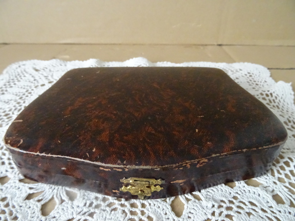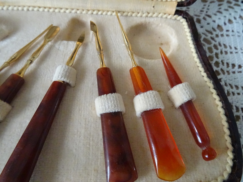 Antieke of vintage pedicure set vervaardigd rond 1920 of later. De instrumenten zijn van koper gemaakt en verrijkt met handvaten van hoorn. De nu nog 7-delige set is in een schitterende gebruikte staat. Er ontbreken twee of drie items, zie foto’s. Het doosje is in goede gebruikte staat, nog best solide.