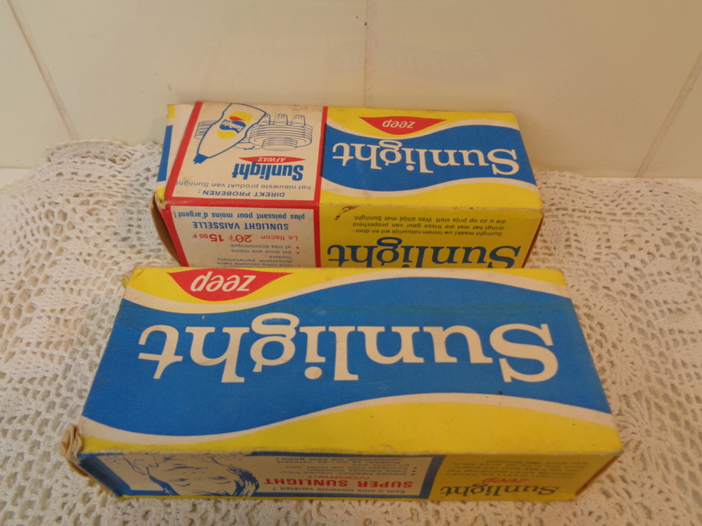 Antieke Sunlight was zeep een prachtige collectie van vier verschillende dozen (zie foto 15) Sunlight uit grootmoeders tijd. De stukken zeep werden gebruikt om handmatig de was te doen met behulp van emmers water en wellicht een wasbord. Alle vier de verpakkingen bevatten nog zeep, zie foto`s. De zeep is in goede conditie, de verpakkingen zijn in goede gebruikte tot redelijke conditie. De afmetingen per verpakking zijn 15.5 bij 6.5 bij 4.2 cm en ze wegen circa 300 gram per stuk. De antieke Sunlight was zeep is afkomstig uit België.