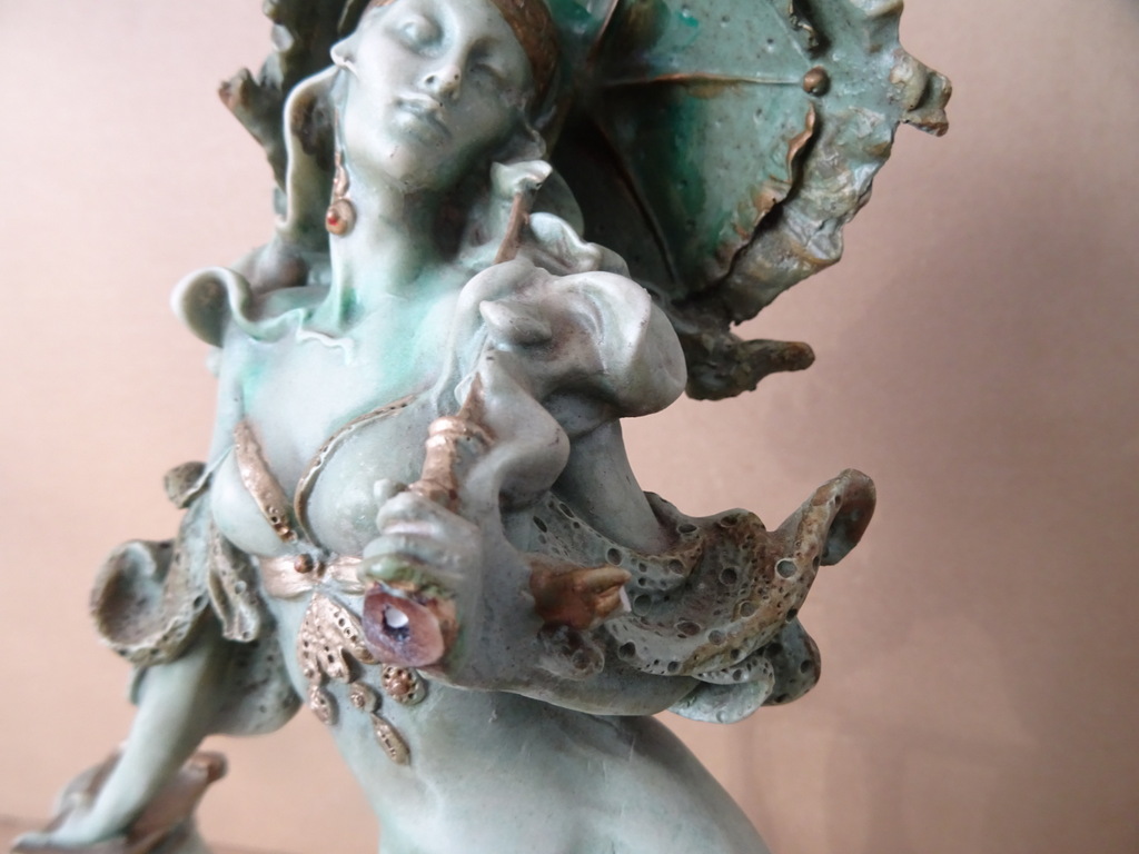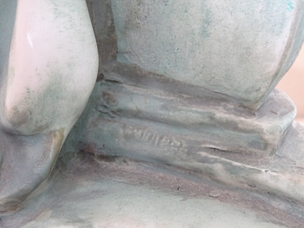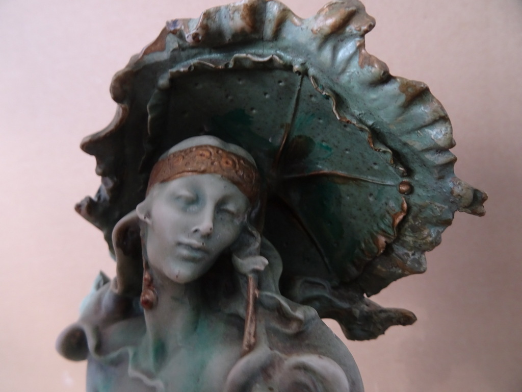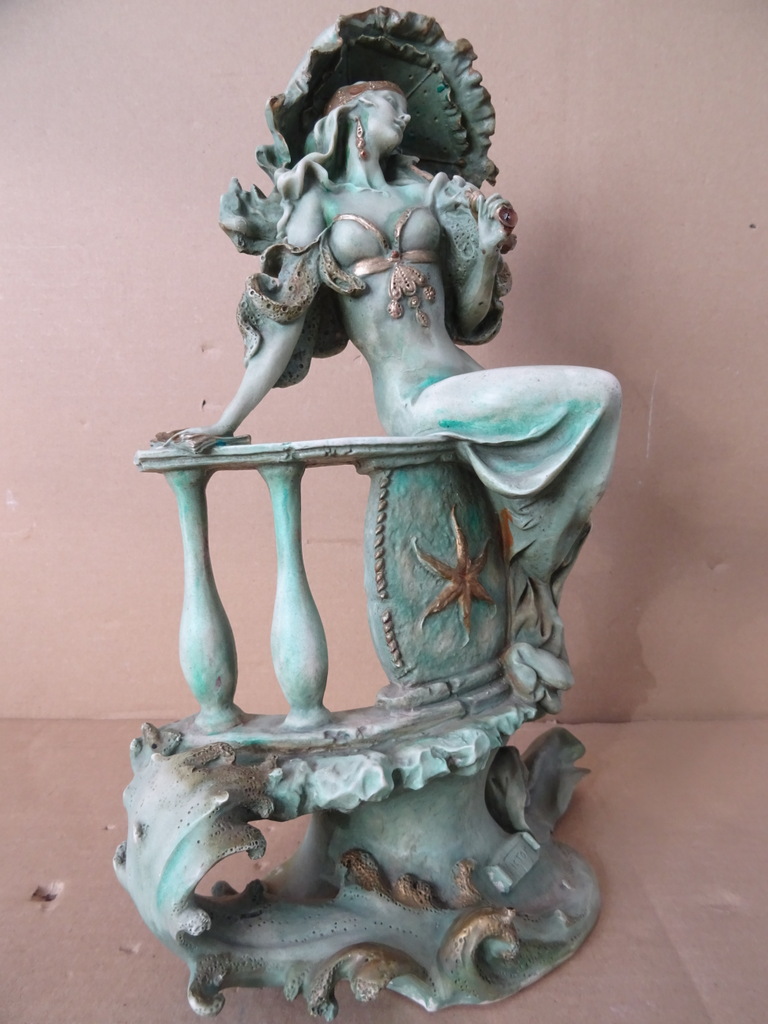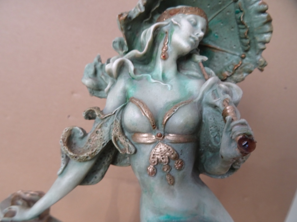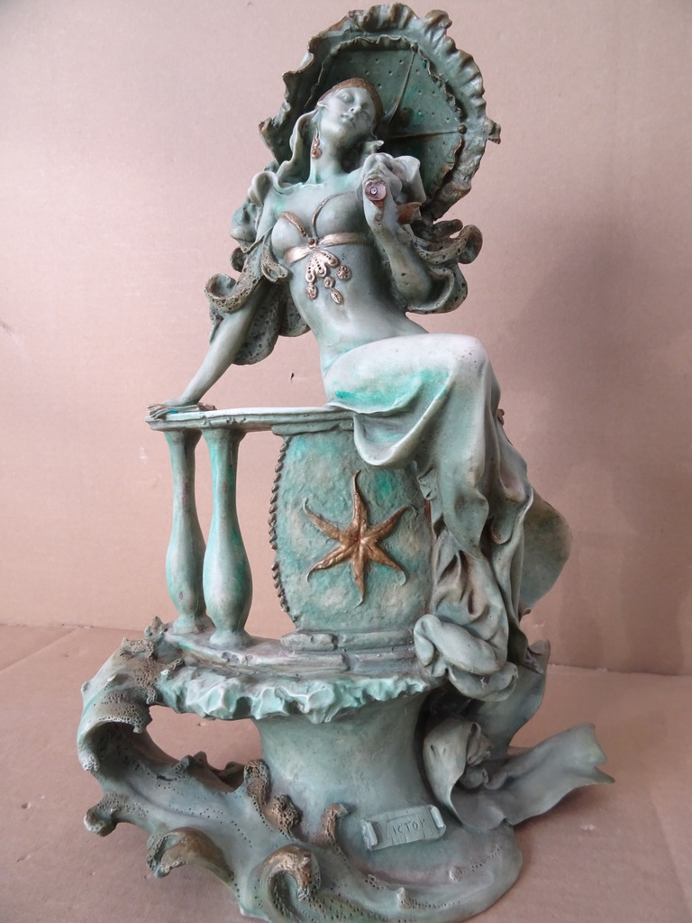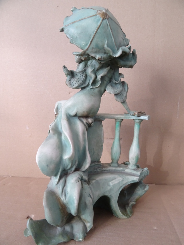 Beeld Guiseppe Armani Summer Outing 35cm Victor vervaardigd rond 1985 of later. Het prachtig gestileerde beeld toont een dame gekleed in Art deco stijl zittend op een ronde balustrade. Ze draagt een grote flamboyante hoed en een parasol. Het originele beeld van Guiseppe Armani uit 1985 was van porselein. Dit is een latere afdruk uit een soort polystone of kunsthars. Het beeld is aan de voorkant gemerkt; Victor. Aan de achterkant staat ook iets, voor mij onleesbaar, zie foto’s. Het beeld is in een schitterende gebruikte staat. De houten voet die er ooit onder was bevestigd ontbreekt. Het beeld staat wel zeer stabiel.