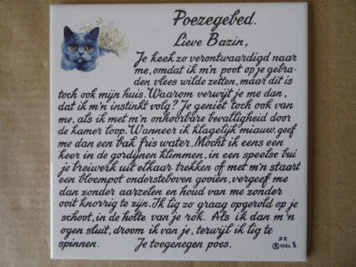 Collectie 8 vintage tegels Mosa paard poes hond 19 euro per stuk vervaardigd rond 1960 of later. U kunt aan het eind van uw bestelling vermelden welke tegel of tegels u graag ontvangt of komt afhalen. Alle tegels zijn in een prachtige gebruikte staat en puntgaaf of bijna puntgaaf. Hier en daar een afwijkend plekje, glazuurbeschadiging of minuscuul chipje, zie foto’s voor alle details. Een plakhaakje om zelf eraan te lijmen wordt meegeleverd, zie laatste foto.
