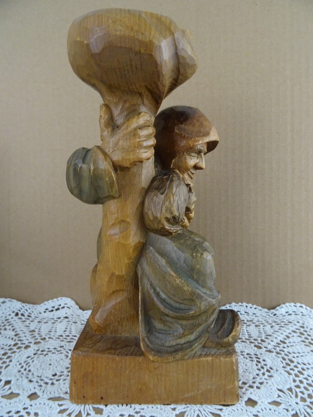 Collectie van drie kandelaars vervaardigd rond 1950 en later. Aardewerk kandelaar; 9.8 bij 9.8 bij 16 cm, puntgaaf. Aluminium kandelaar; 12 bij 12 bij 22 cm, goede gebruikte staat, solide. Deze kandelaar kan verzonden worden als brievenbus-pakje. Houten kandelaar oude vrouw met kat; 10.2 bij 11.5 bij 26 cm. Deze kandelaar kan iets ouder zijn. Met de hand gesneden, puntgaaf. Slechts een of twee lakbeschadigingen, zie foto’s. Ook los te koop; De aardewerk en de aluminium kandelaar voor 9 euro per stuk, de houten kandelaar voor 19 euro. Totaal gewicht; 1.3 Kg, ingepakt ruim 2 Kg.