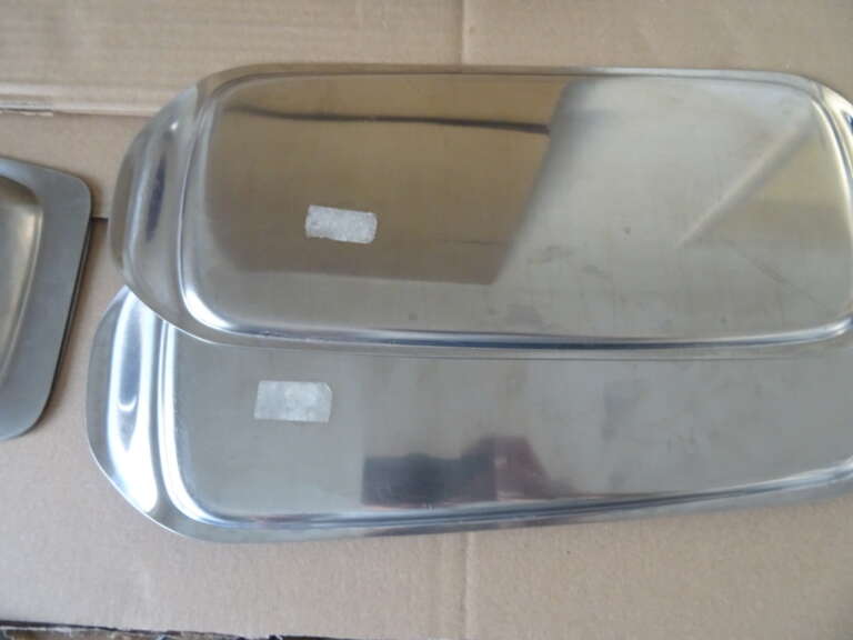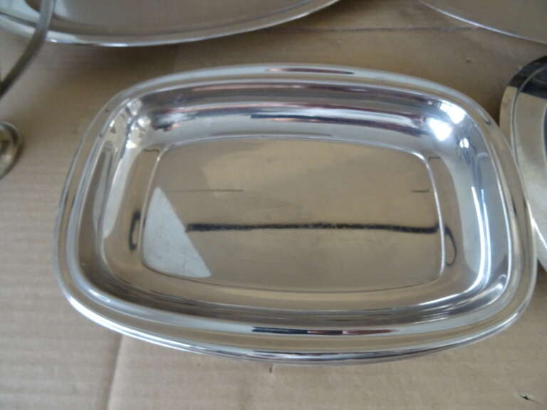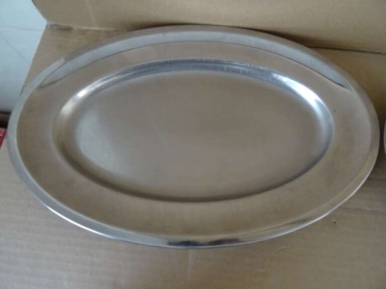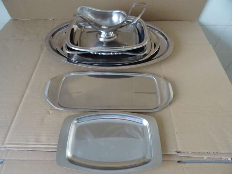 Collectie vintage RVS serveerschalen vervaardigd rond 1960 of later. Een collectie van 10 schalen en een juskom. In een prachtige gebruikte staat, zonder deukjes. Er is één metalen schaal bij (de grootste), zie foto’s. Kleinste schaal circa 24 bij 14,5 bij 1,3 cm, grootste schaal circa 45,5 bij 28,7 bij 3,2 cm. Presenteer uw maaltijden in stijl! Alles is schoon en klaar voor gebruik.