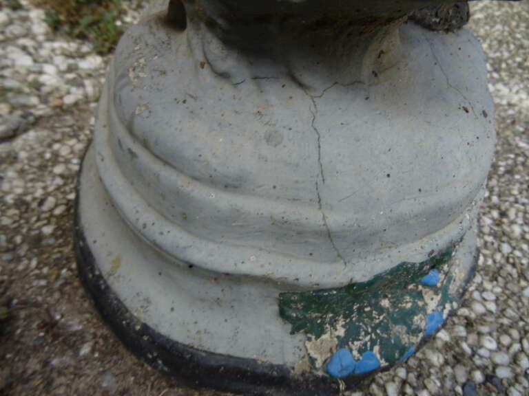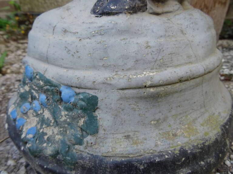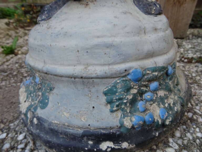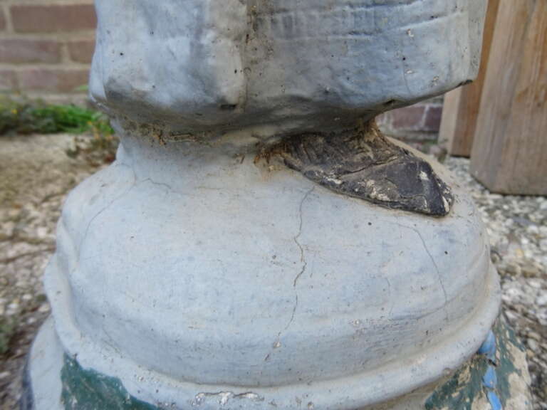 Fraai massief beeld dame met druiven 77cm vervaardigd rond 1950 of later. Een schitterend beeld, een echte eyecatcher, gemaakt van beton ofwel een mix van meerdere materialen. Afgebeeld is een dame die een mand vol blauwe druiven op haar hoofd draagt. Het beeld is in een schitterende gebruikte staat. Het staat al jaren of tientallen jaren buiten. Er ontbreekt een klein stukje aan het puntje van de neus, het valt haast niet op, zie foto’s. Een prachtig beeld om uw tuin mee te verrijken, eventueel voorzien van een nieuwe kleur. De herkomst en de maker zijn onbekend, het beeld stond al die tijd in een tuin in zuid Limburg. Het stuk weegt ruim 29 kilo, het is te zwaar voor verzending met de normale post. Bezorging is eventueel wel mogelijk, na overleg en bijbetaling. Ook verzending is in sommige gevallen mogelijk met een speciale pakketdienst na overleg en bijbetaling. Speciale afhaalprijs 69 euro.