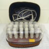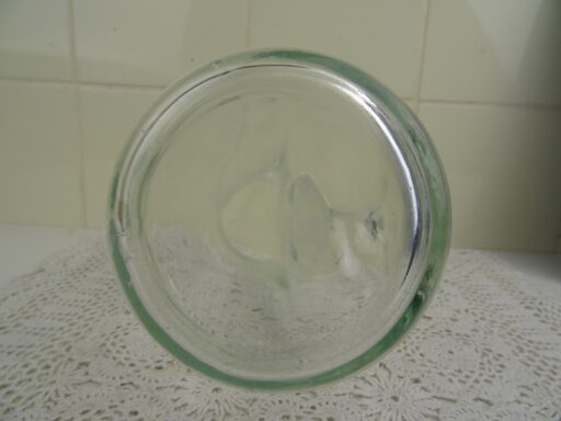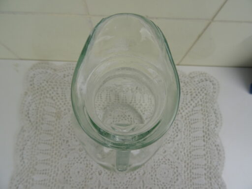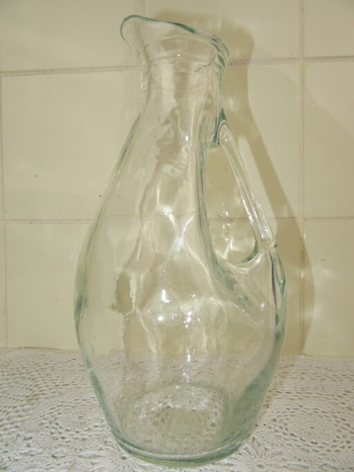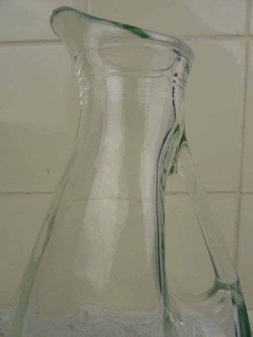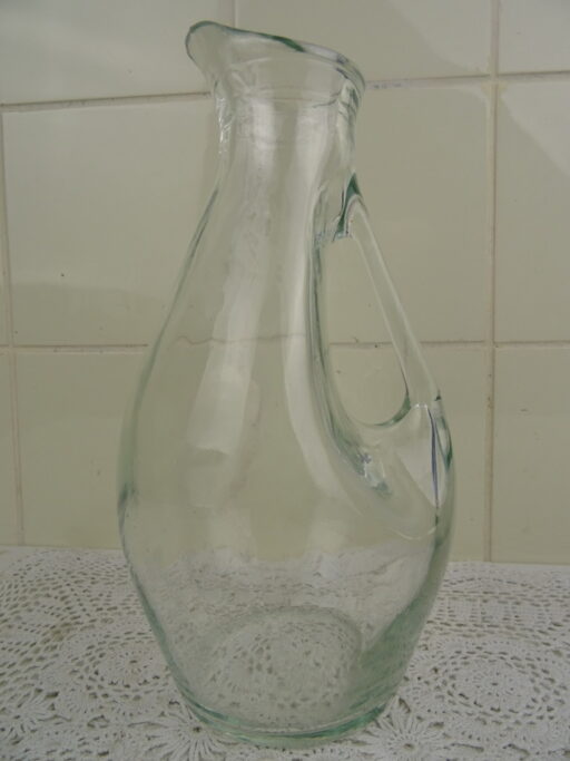 Fraaie glazen waterkan of met een opvallend uiterlijk. Nadat de kan werd geblazen werd ze aan een kant ingeduwd, vervolgens werd het handvat er (koud) tussenin bevestigd. De waterkan werd vervaardigd rond 1950 en is in goede staat, met geringe sporen van gebruik. Dat wil zeggen enkele kleine krasjes en wat aanslag, zie foto’s. De kan is echter nog steeds een lust voor het oog en prima te gebruiken!
