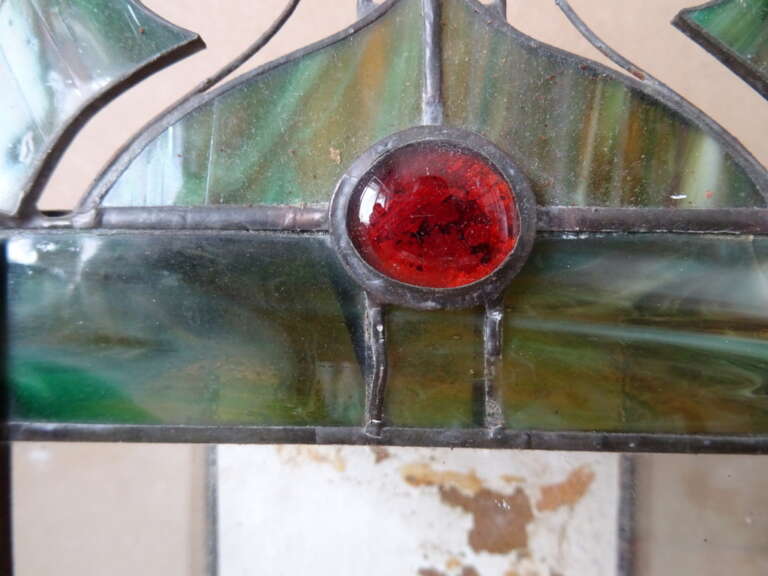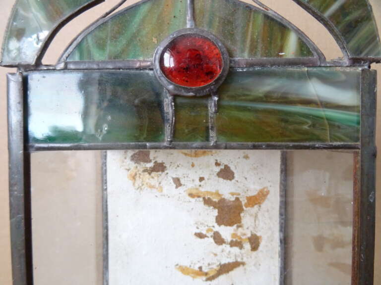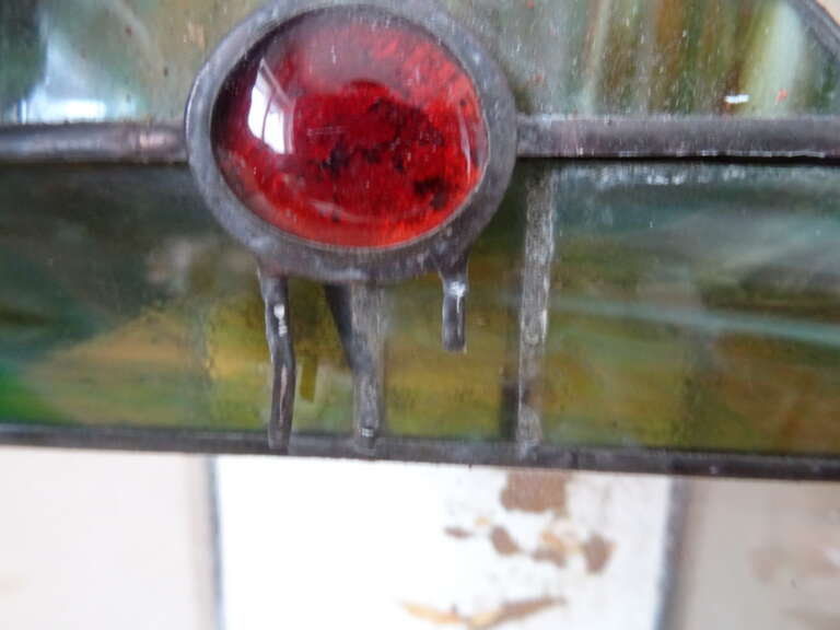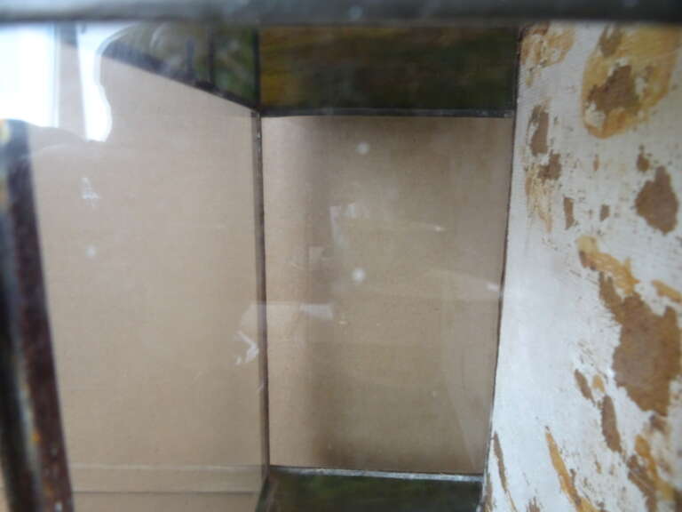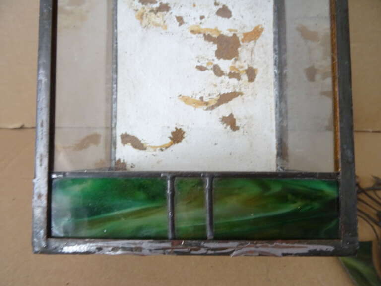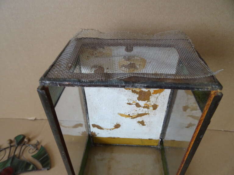 Glas in lood huisje vintage terrarium (?) vervaardigd rond 1950 of later. In redelijke gebruikte staat. Dat wil zeggen het bovenstuk is onlangs losgegaan, er is één stukje glas (bovenin het deurtje) met een barstje en het metaal aan de bovenkant is los, zie foto’s. Om de eerste foto te maken heb ik het losse stukje er heel voorzichtig opgezet, zie foto’s. Wie handig is met een soldeerbout zal het eenvoudig kunnen herstellen. Afmetingen indien hersteld; circa 14,5 bij 10,2 bij 30 cm. Hoogte exclusief bovenstuk circa 22 cm.