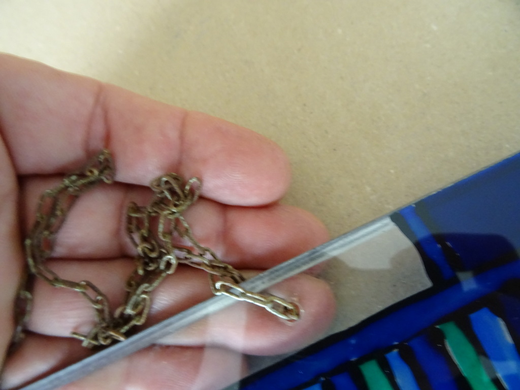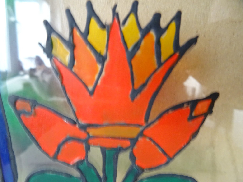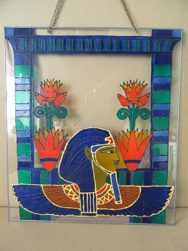 Glas in lood plexiglas Egypte 36x40cm vervaardigd rond 1970 of later. In schitterende gebruikte staat, puntgaaf. Slechts enkele lichte krasjes en het kettinkje is wat verweerd, zie foto’s. De ware schoonheid wordt zichtbaar zodra het stuk voor een raam hangt, zie foto 14.