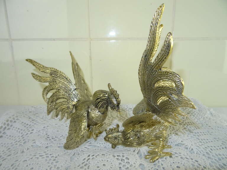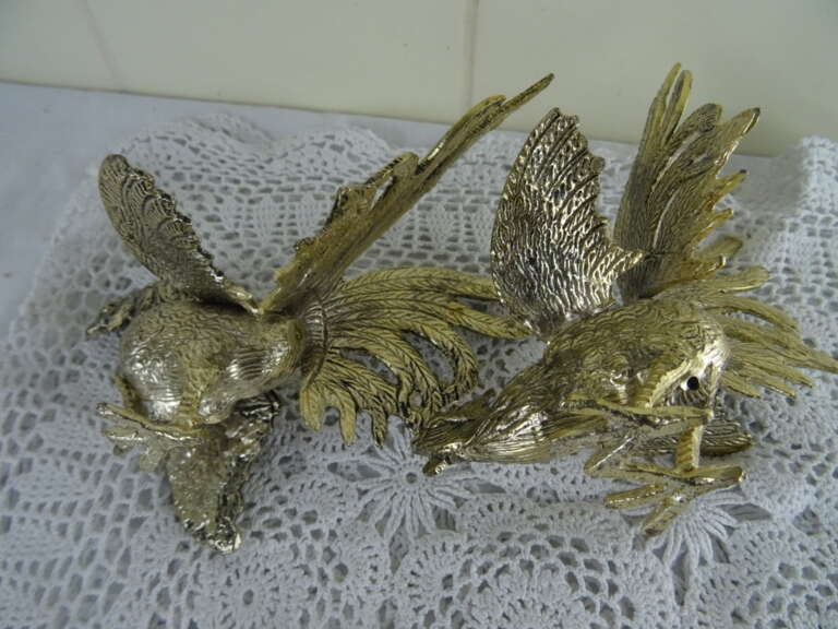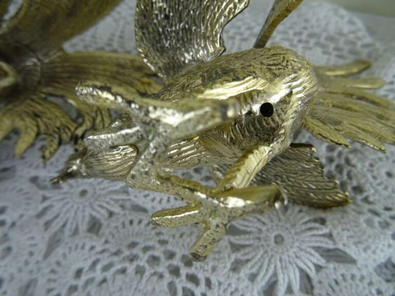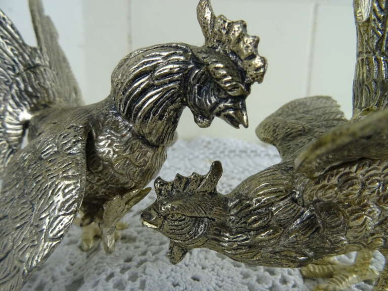 Imposante verzilverde kemphanen vervaardigd rond 1950. De tafelstukken zijn gemaakt van zwaar verzilverd koper. De fraaie kemphanen zijn een lust voor het oog. Hun houdingen zijn levensecht weergegeven. Ze zijn verwikkeld in een fel gevecht! Beide beelden zijn in goede staat, haast als nieuw. De afmetingen zijn circa 15 bij 10 bij 12 cm.
