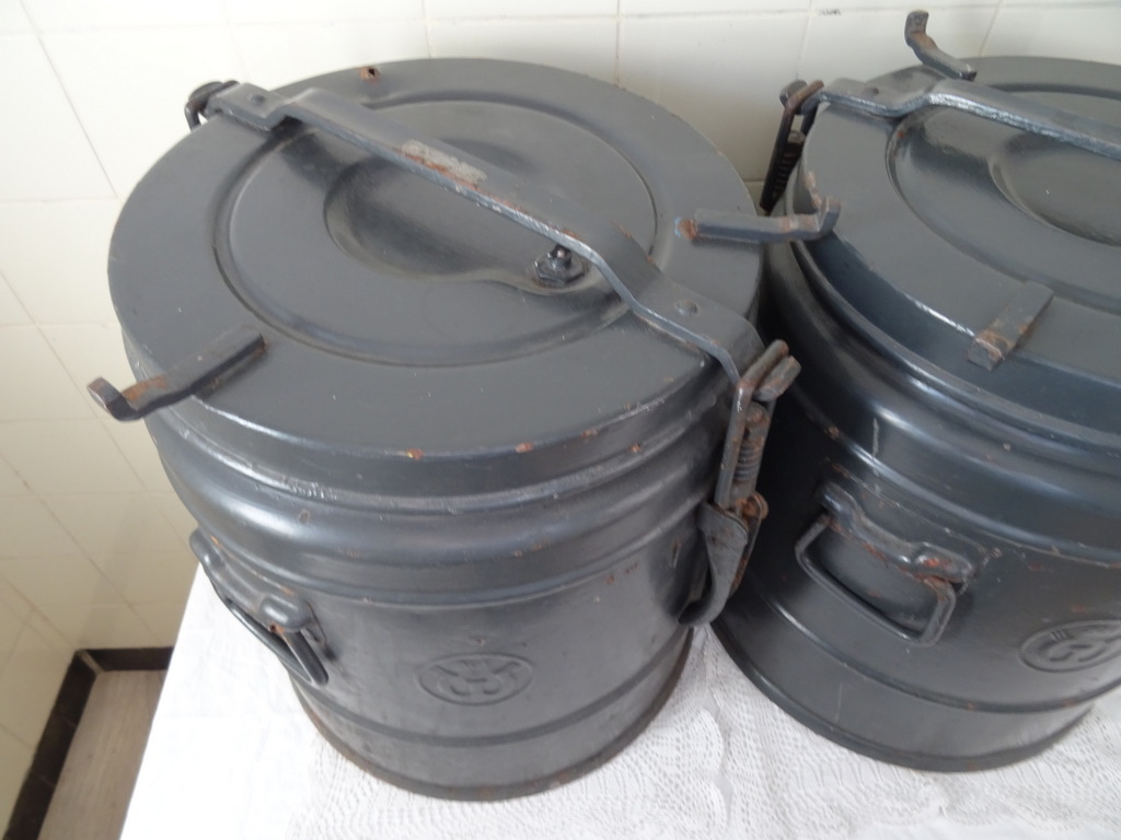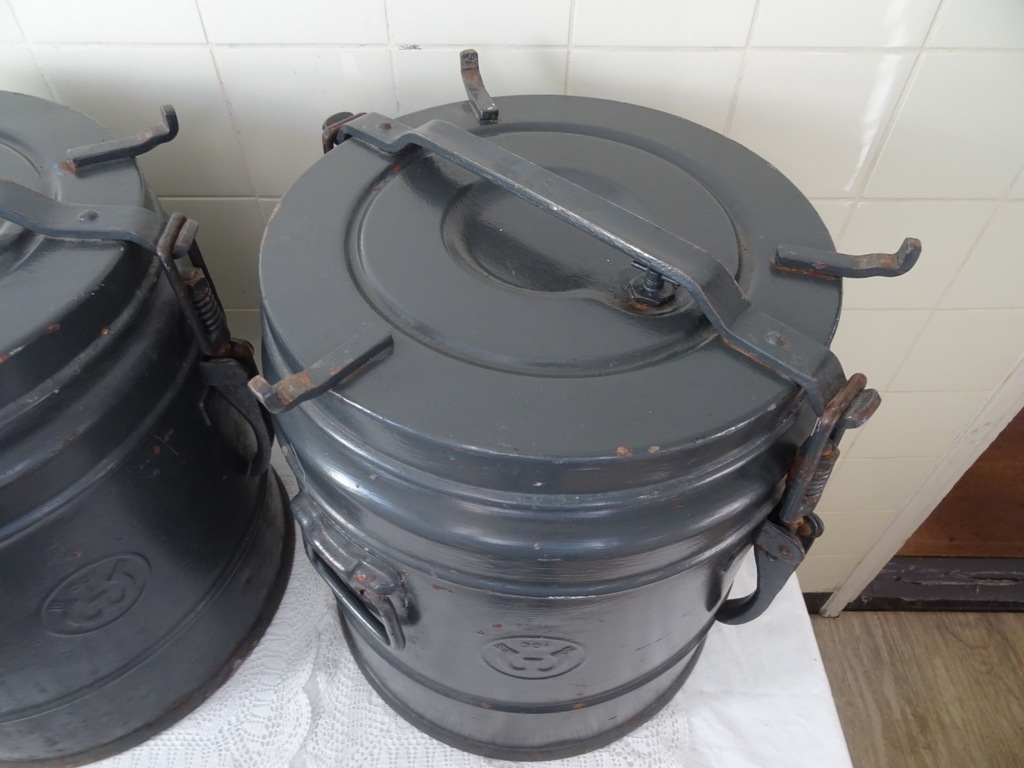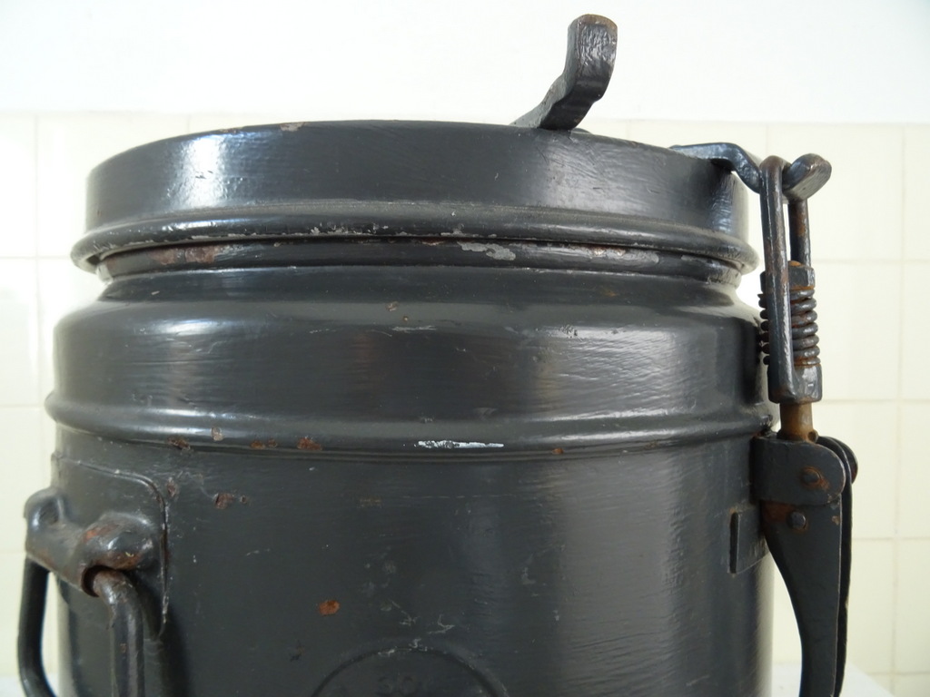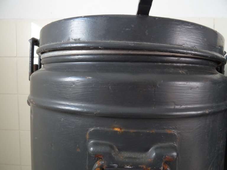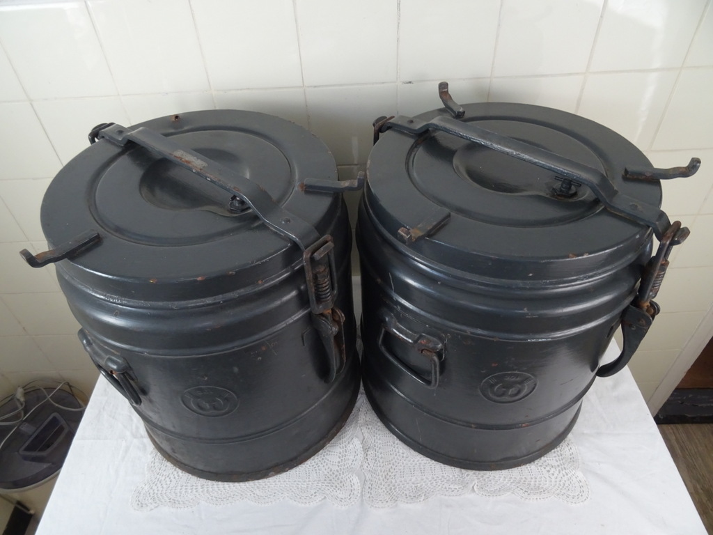 Koppel enorme metalen gamellen (ketels) vervaardigd in de eerste helft van de vorige eeuw. Vaten zoals deze waren in gebruik bij bijvoorbeeld het leger en Jeugdbewegingen. Ze zijn bedoeld om eten warm te houden en te vervoeren. De stapelbare gamellen hebben een inhoud van 30 liter. Ze zijn in goede gebruikte staat en mogelijk nog bruikbaar. Er kunnen natuurlijk ook bloemen of planten in. Een van de vaten sluit momenteel niet goed. Dit zal een kwestie zijn van de schroeven bijstellen. Van een vat ontbreekt een stukje aan de bovenkant, zie foto’s. Ze wegen 16.8 Kg per stuk. Speciale afhaalprijs 69 euro!