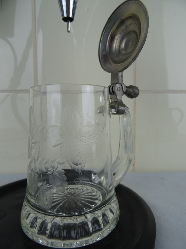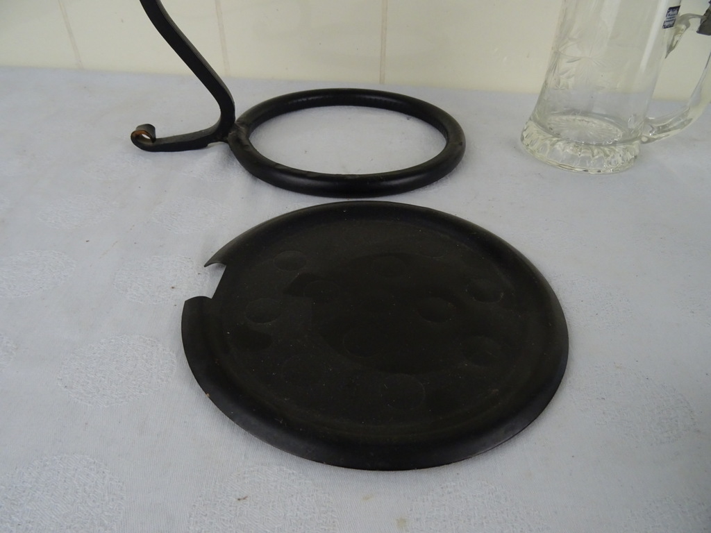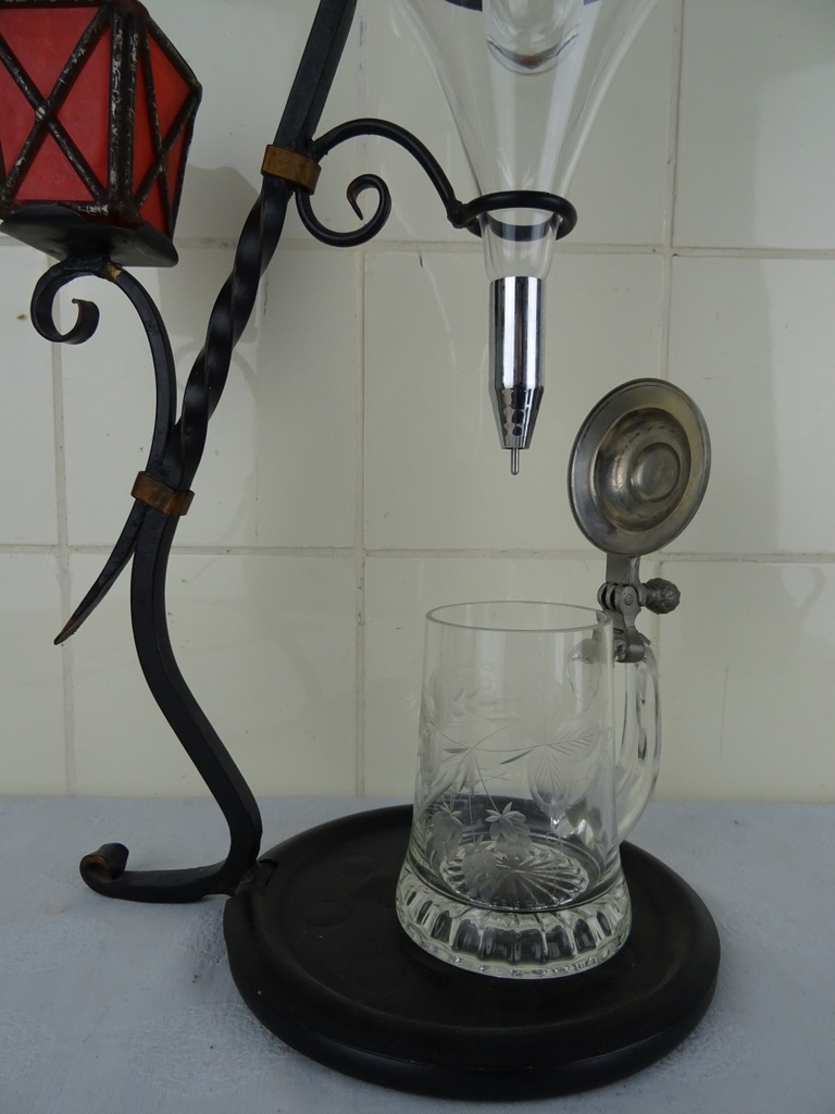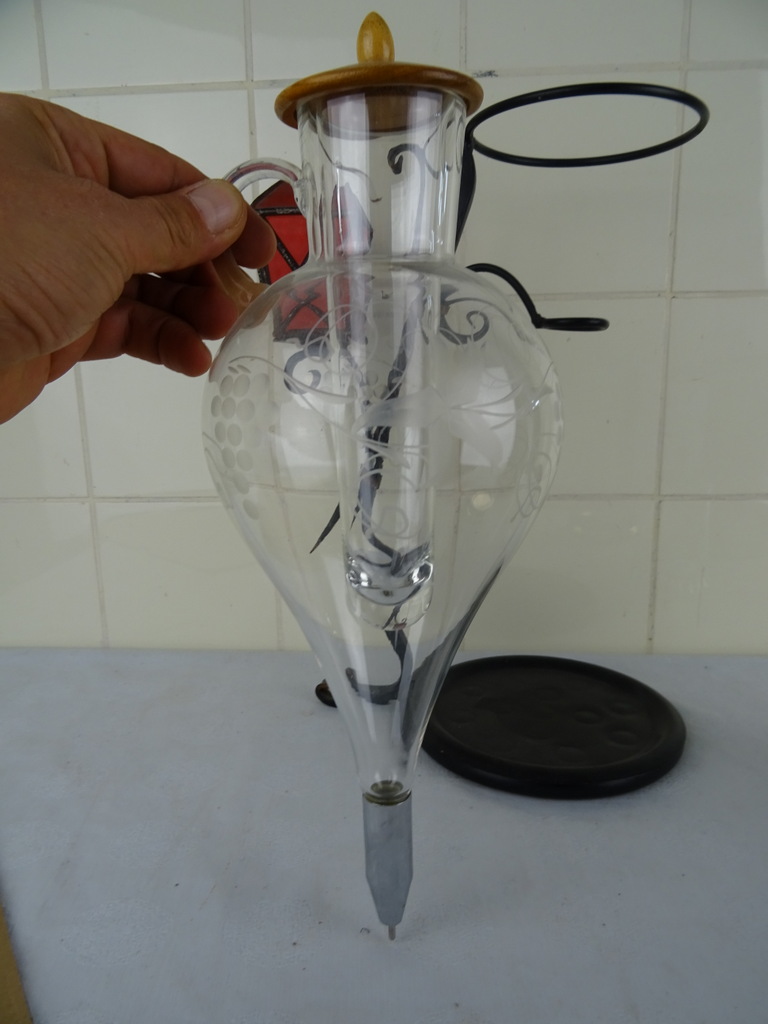 Steampunk object vintage wijnkaraf vervaardigd rond 1950 of later. Volgens mijn informatie is dit rare object een vintage wijnkaraf met glazen ballon van smeedijzer en glas maar het zal zeker niet misstaan als Steampunk object. Het stuk is in een prachtige gebruikte staat. Wel is het binnenste glaasje stuk, zie foto’s. Wanneer het dekseltje erop ligt valt het haast niet op.