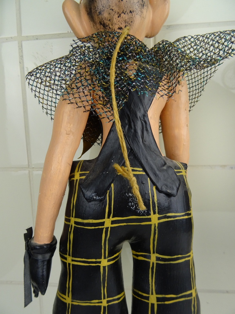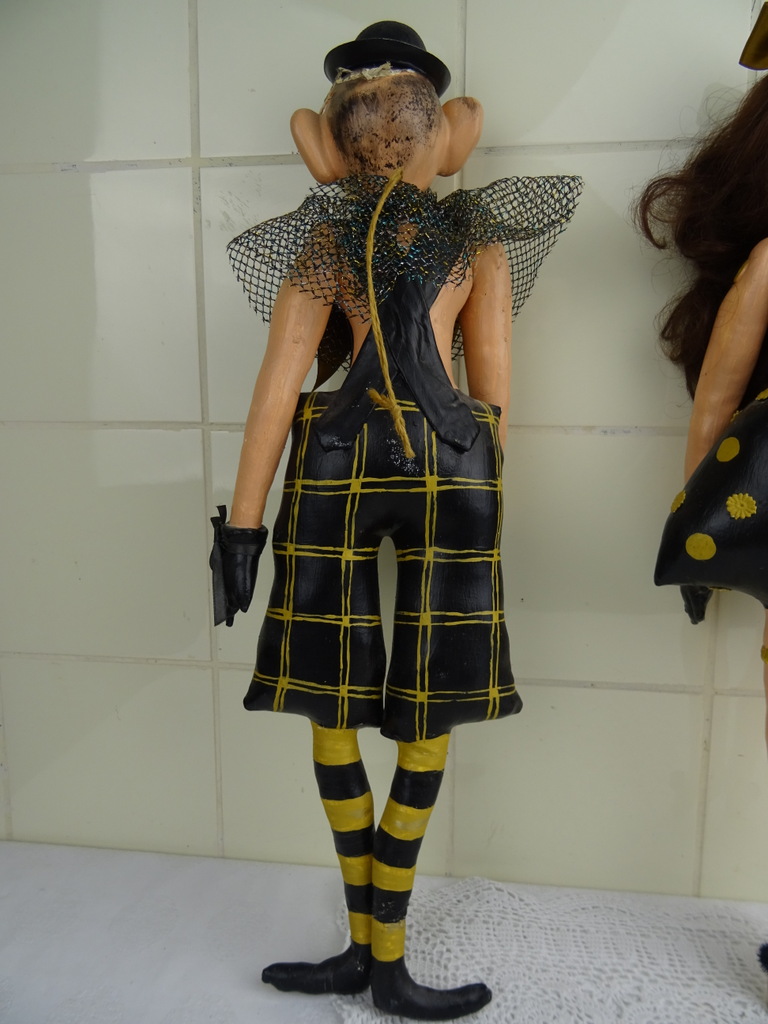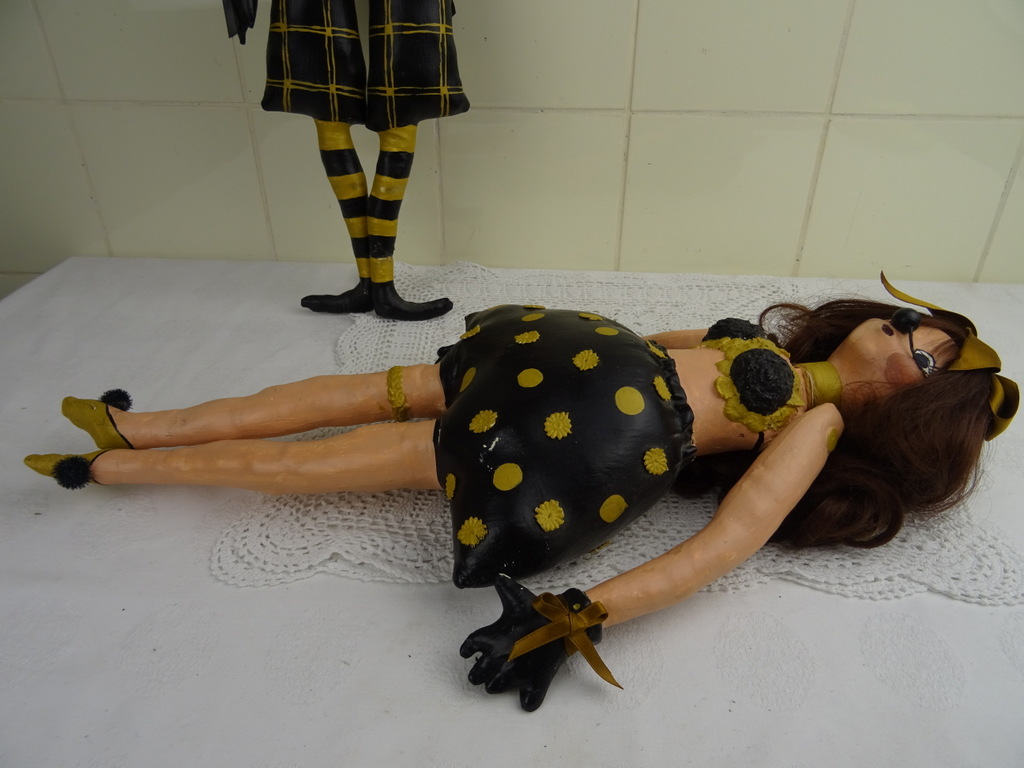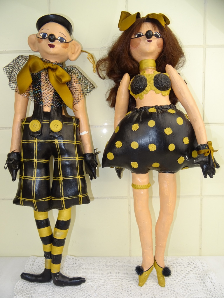 Twee lieflijke clown poppen om op te hangen vervaardigd in de tweede helft van de vorige eeuw. Ze behoren waarschijnlijk tot de volkskunst. De fraaie poppen zijn gemaakt van een soort kunststof dat gevuld lijkt te zijn. Hierdoor voelen ze bijna aan als een mens. De poppen zijn in goede gebruikte staat, hier en daar mist er wat verf. Het bolletje van de hoed van de man is los gegaan. Dit is makkelijk verholpen met wat lijm. De clowns lijken balletdansers te zijn. Ze zijn ongeveer 20 cm breed en 49 cm lang. Indien gewenst worden deze schitterende poppen voor u in ere hersteld.