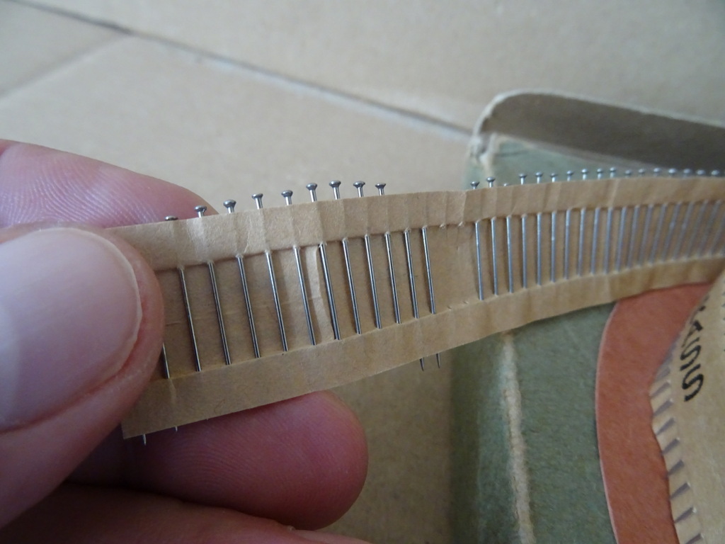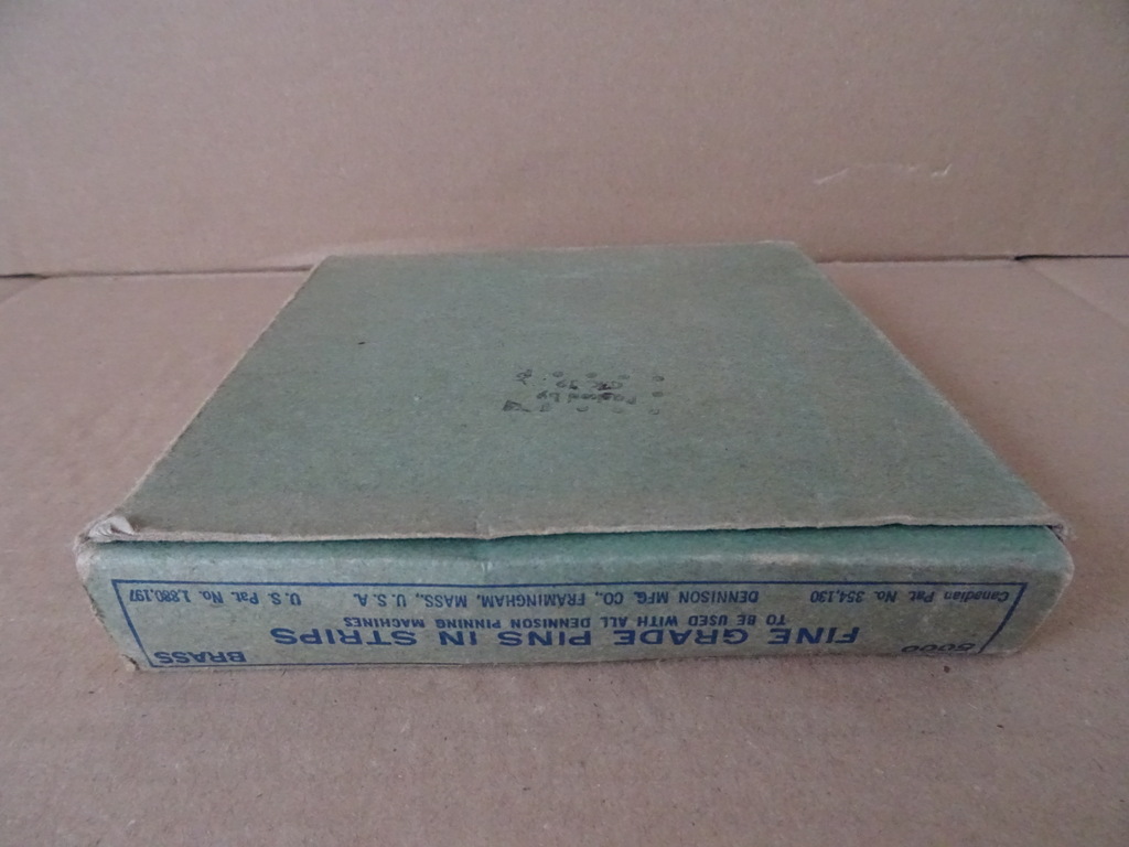 Vintage Dennison pinning machine Fine grade pins in strips to be used with all Dennison pinning machines vervaardigd in de Verenigde Staten rond 1960. Nieuw in de originele kartonnen verpakking. Er missen slechts enkele spijkertjes (circa 0,1 cm dik) aan het begin van de rol.