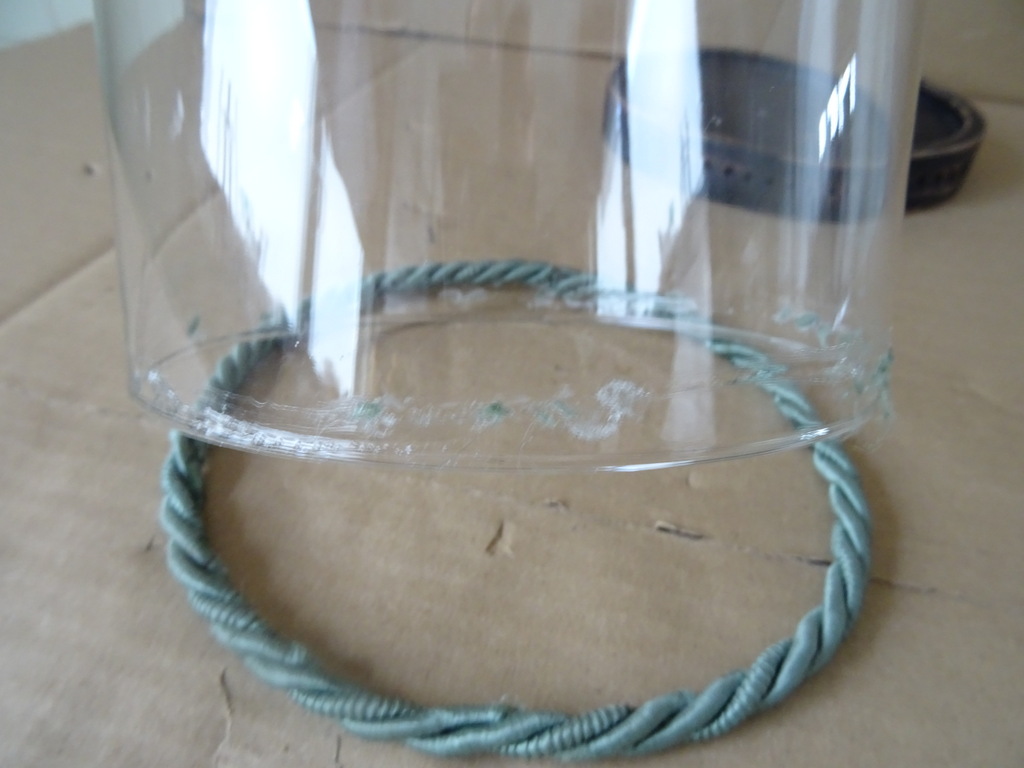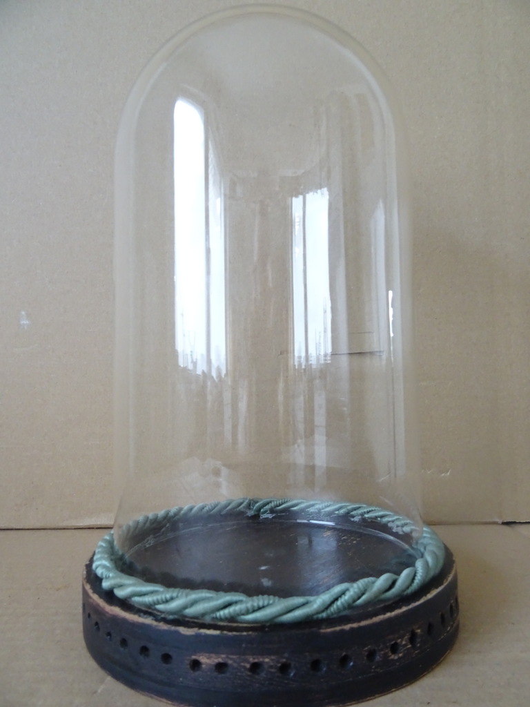 Vintage glazen stolp met voet 28cm vervaardigd rond 1950 of later. De glazen stolp heeft een doorsnede van 14 cm en is 26 cm hoog, 28 cm inclusief voet. De voet is iets te groot, er past eigenlijk een stolp met een doorsnede van 15 cm in. Door het dikke koord valt dit gelukkig niet heel erg op. Het koord is in het verleden aan de stolp vastgelijmd. De lijmresten rondom zijn niet te verwijderen, zie foto’s. De stolp is verder in goede gebruikte staat, puntgaaf. Er zijn wat lichte krasjes / vlekjes die niet echt opvallen.