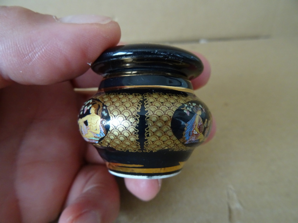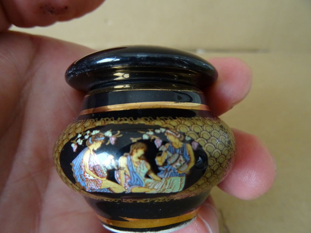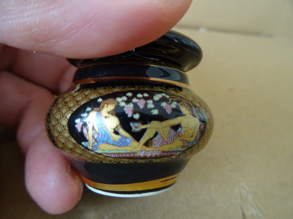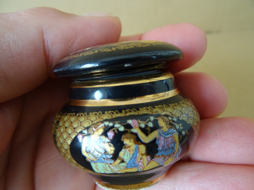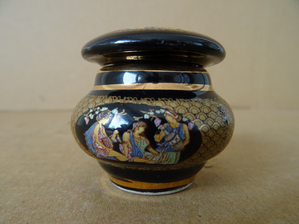 Vintage Grieks crème potje van porselein vervaardigd rond 1960 of wat later. In nog vrij goede staat, puntgaaf, zie foto’s. Handbeschilderd met taferelen uit de Griekse mythologie.