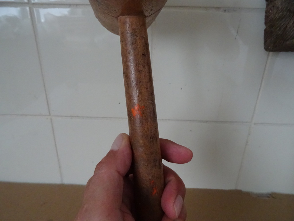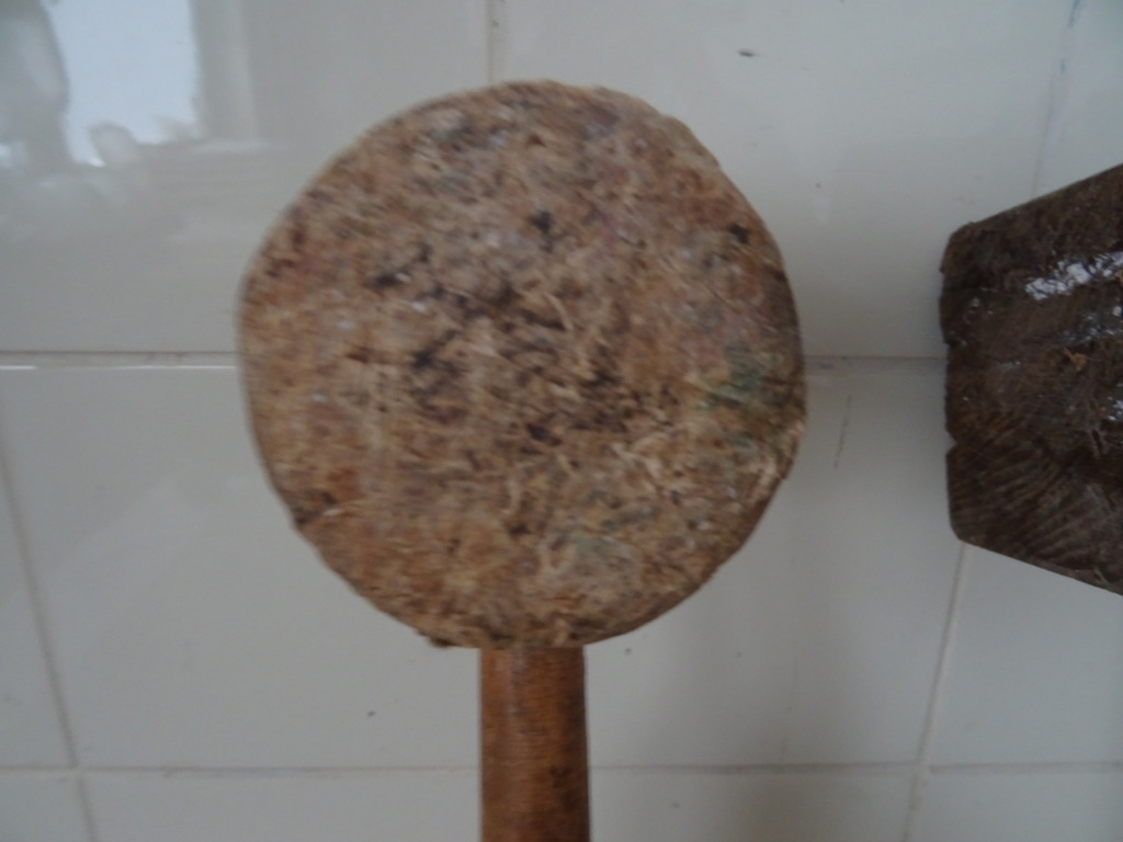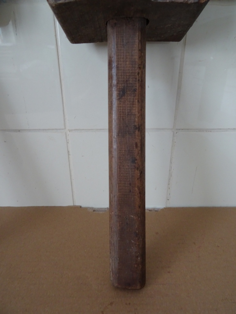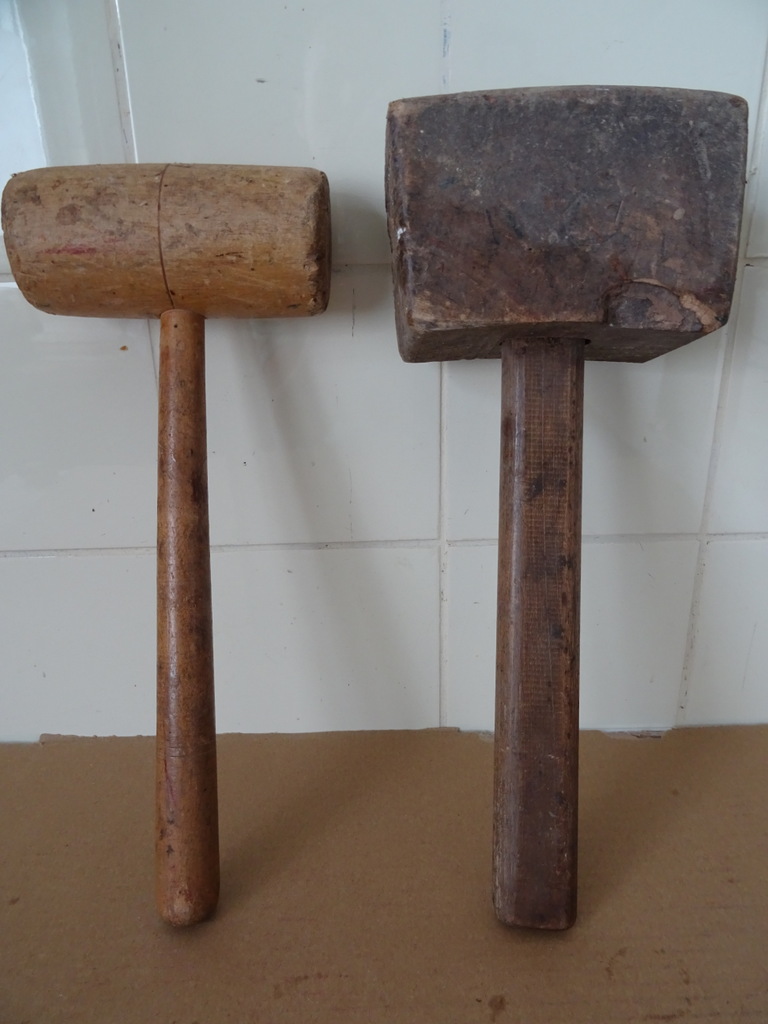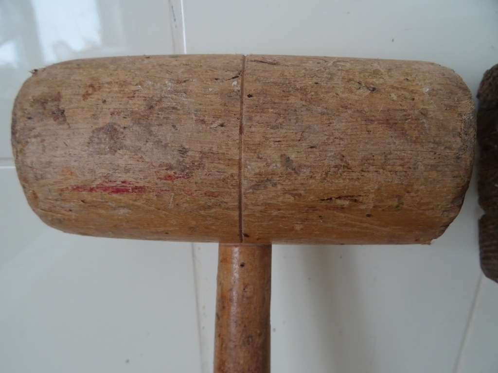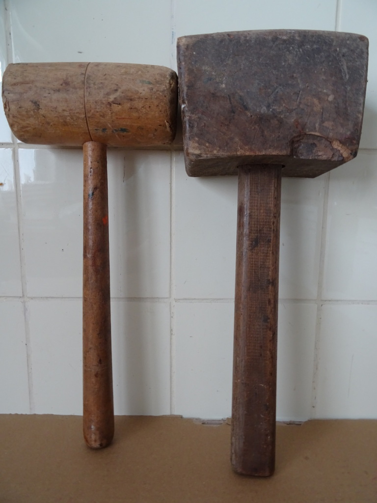 Vintage houten hamers vervaardigd rond 1950 of iets later. Beide hamers zijn in een prachtige gebruikte staat, zie foto’s. Indien nodig zijn ze ook nog prima te gebruiken. De afmetingen van de kleinste hamer zijn circa 13,5 bij 6,5 bij 35 cm. De afmetingen van de grote hamer zijn circa 14 bij 9 bij 36 cm. Indien gewenst los te koop voor 19 en 29 euro.