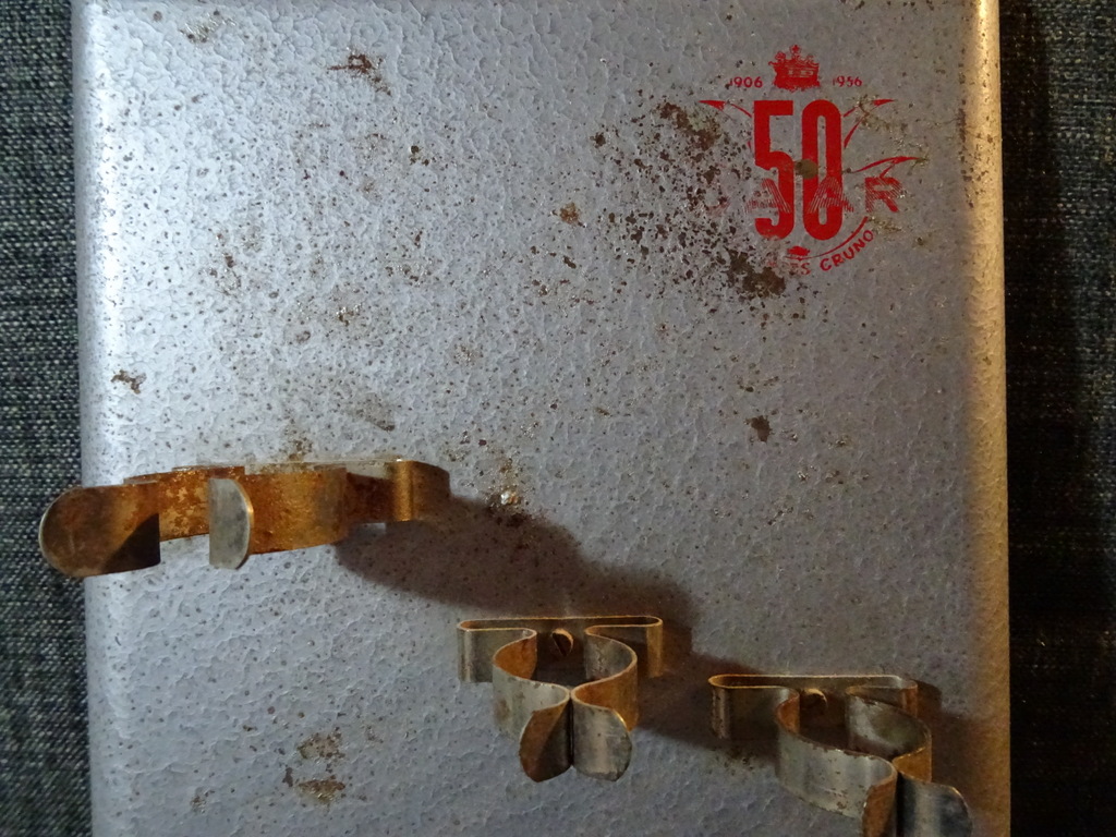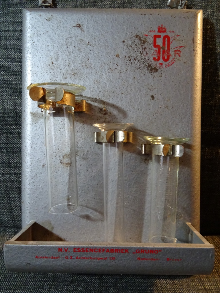Vintage industrieel object Essencefabriek Gruno met glazen kannetjes vervaardigd rond 1960 of iets later. In een prachtige gebruikte staat, zie foto’s. De glazen kannetjes zijn puntgaaf. Men gebruikte ze om geur en smaakstoffen te mengen in een Limonadefabriek (Essence fabriek Gruno, limonade / gazeuse). De kannetjes konden na het afwassen omgekeerd ophangen en uitlekken, zie foto’s. Afmetingen metalen rekje; 22 bij 32 bij 8 cm.