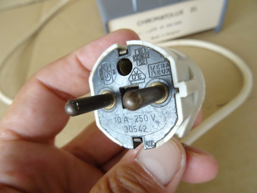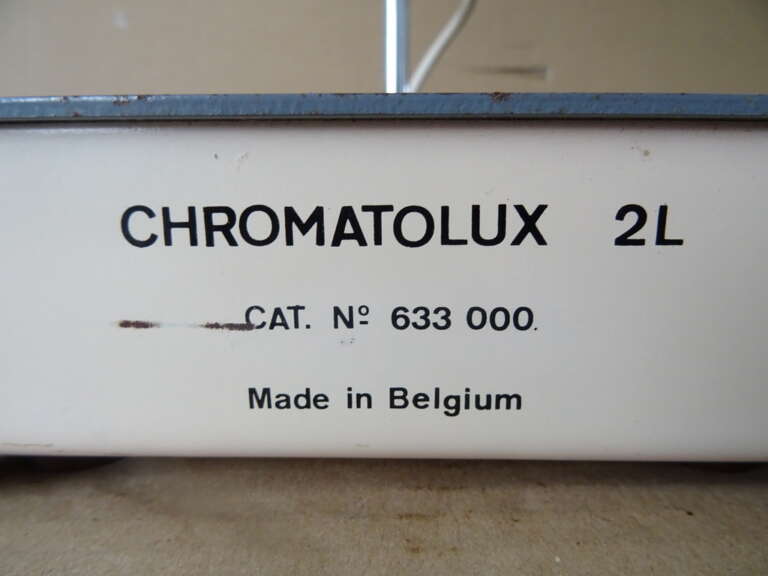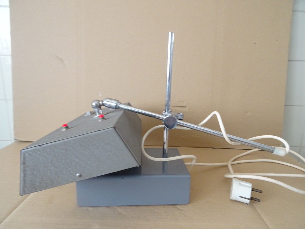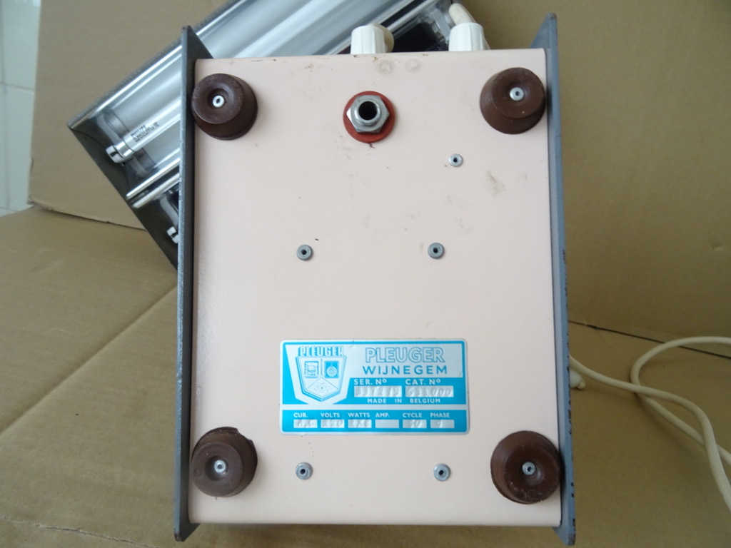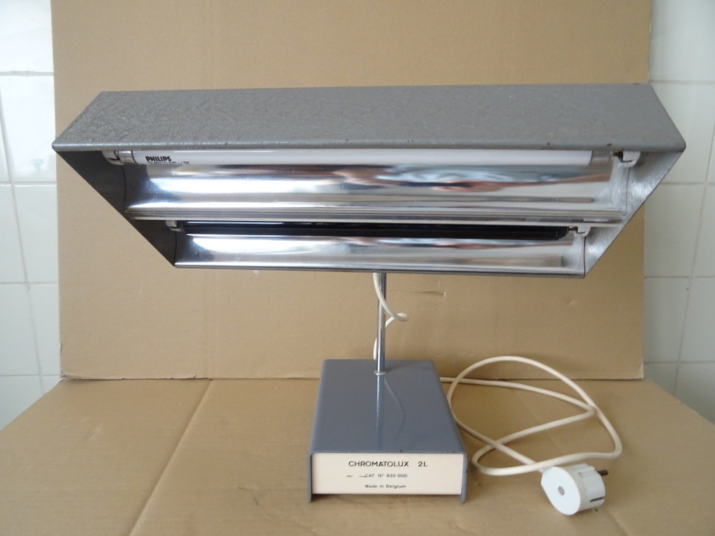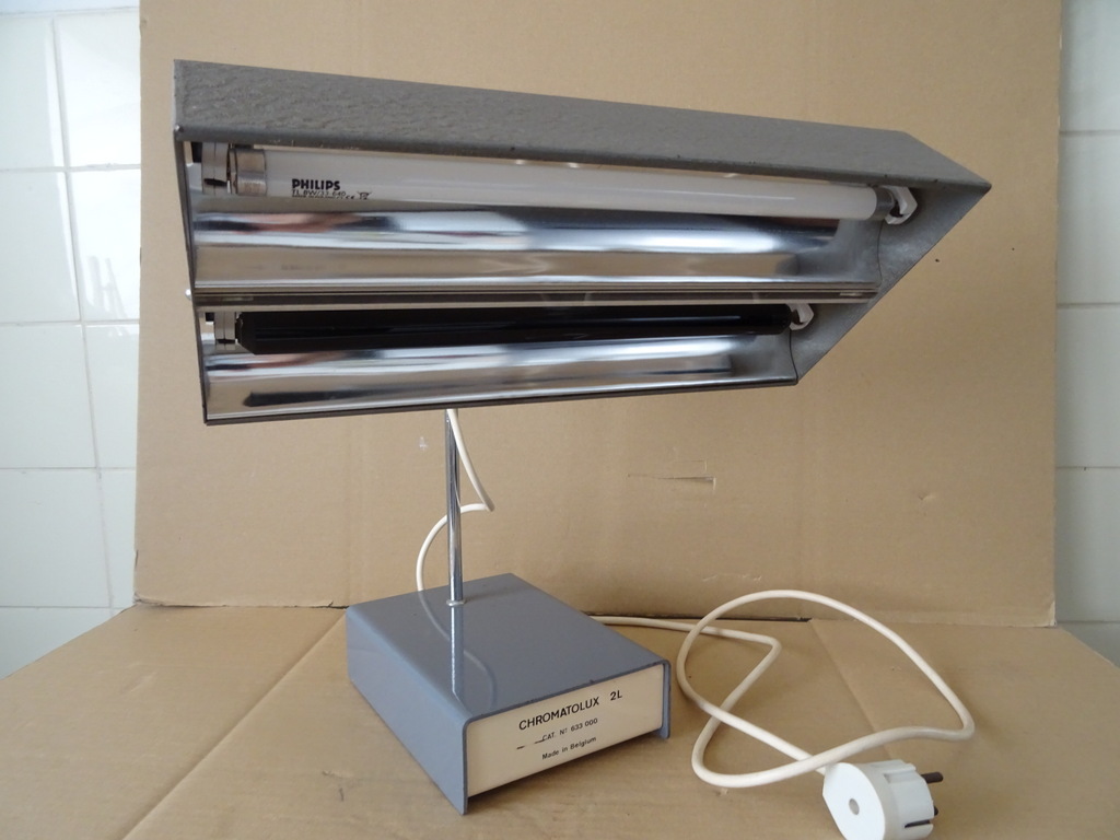 Vintage industriële design bureaulamp Chromatolux 2L vervaardigd door Pleuger Wijnegem in België rond 1960 of later. Een zeldzame metalen lamp afkomstig uit een collectie. Ze is verstelbaar en voorzien van een normale en een ultraviolet tl-buis, deze werken beide nog. Ik vond informatie waaruit bleek dat dit men type lamp in laboratoria gebruikte om zaken te detecteren met ultraviolet licht. De rode knopjes dienen om het licht te dimmen. Dat wil zeggen zolang ze worden ingeduwd gaat het licht uit. Hierdoor hoefde men niet telkens de lamp weer opnieuw uit en weer aan te zetten. Verrijk uw interieur of uw collectie met deze tijdloze industriële bureaulamp / tafellamp. Ze is in een schitterende gebruikte staat en werkend.