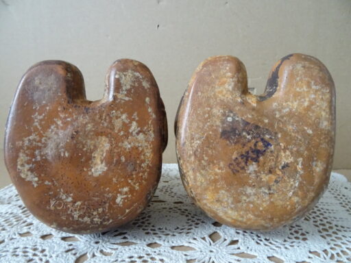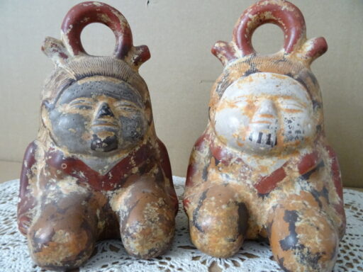Vintage inheemse aardewerk beelden Peru 16cm en 17cm hoog vervaardigd rond 1970 of later. De mystieke beelden tonen een zittende figuur met gesloten ogen alsof ze slapen of in trance zijn. Ze zijn in nog vrij goede staat, puntgaaf. Het zijn kopieën van eeuwenoude beelden. Ze zijn zo natuurgetrouw vervaardigd dat ze voor de zekerheid gemerkt zijn aan de onderkant, zie foto’s. In ieder geval twee echte eyecatchers.