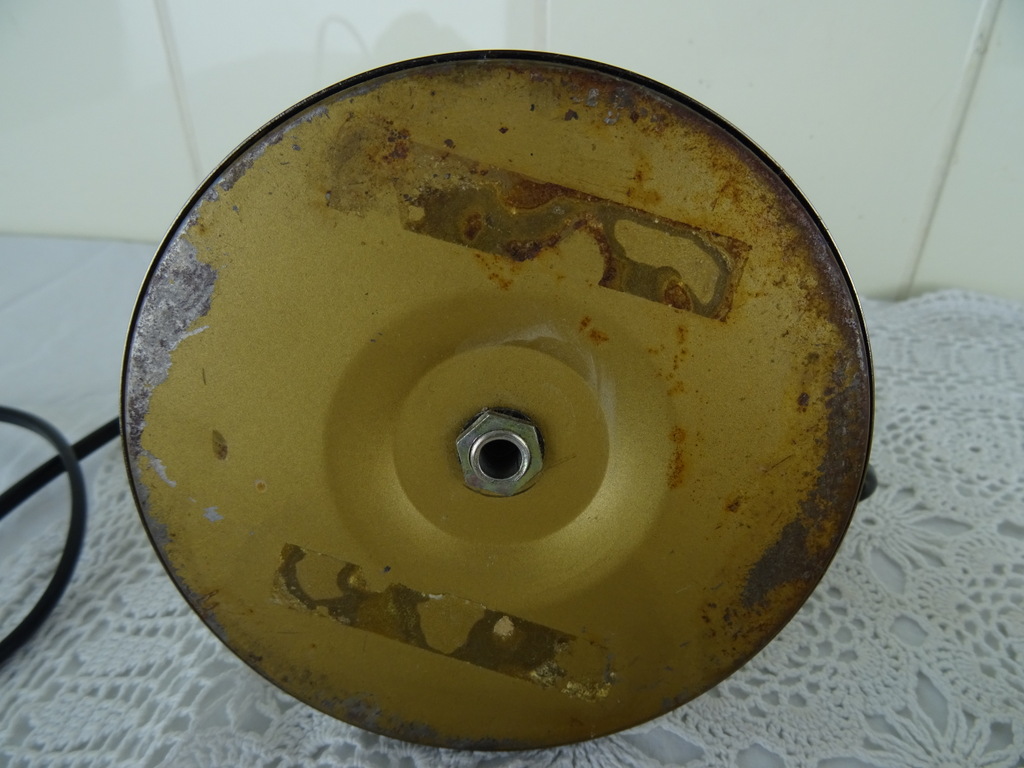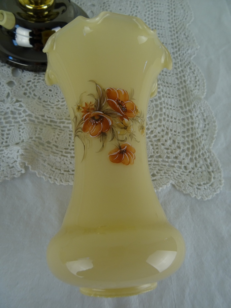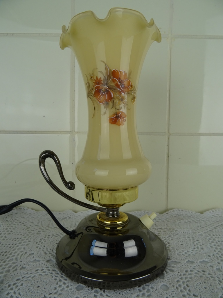 Vintage nachtlampje met opaline glas vervaardigd rond 1950. De sfeervolle metalen lamp is een lust voor het oog dankzij het fraaie opaline gemarmerd glas en het elegante handvat. Op het schulpvormige glas is florale decoratie geschilderd. Kortom; een verrijking voor uw interieur! De lamp is nog in vrij goede en werkende staat, het glas staat slechts iets scheef, zie foto’s.