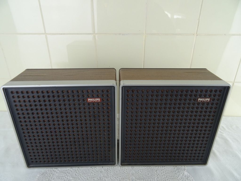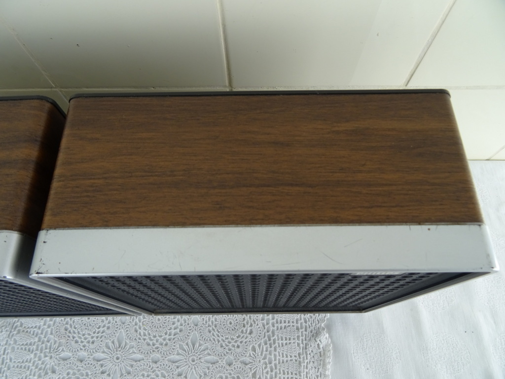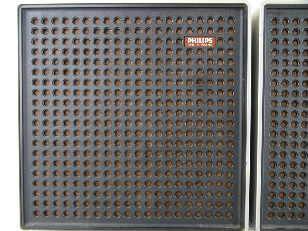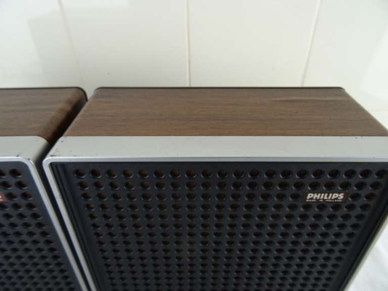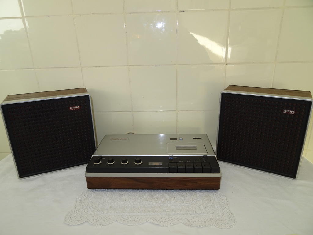 Vintage Philips stereo N2405 cassette recorder met de originele luidsprekers vervaardigd rond 1976. De fraaie zeldzame set werkt nog perfect. Het geheel is in goede gebruikte staat. Het fineer bovenop de luidsprekers is wat gaan werken, zie foto’s. Het geluid klinkt echter verrassend goed! De kabels van de luidsprekers zijn mogelijk vervangen. Afmetingen cassette recorder; 34 bij 21 bij 7.5 cm. Afmetingen luidsprekers; 22.5 bij 10.5 bij 22.5 cm.