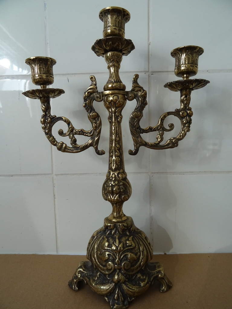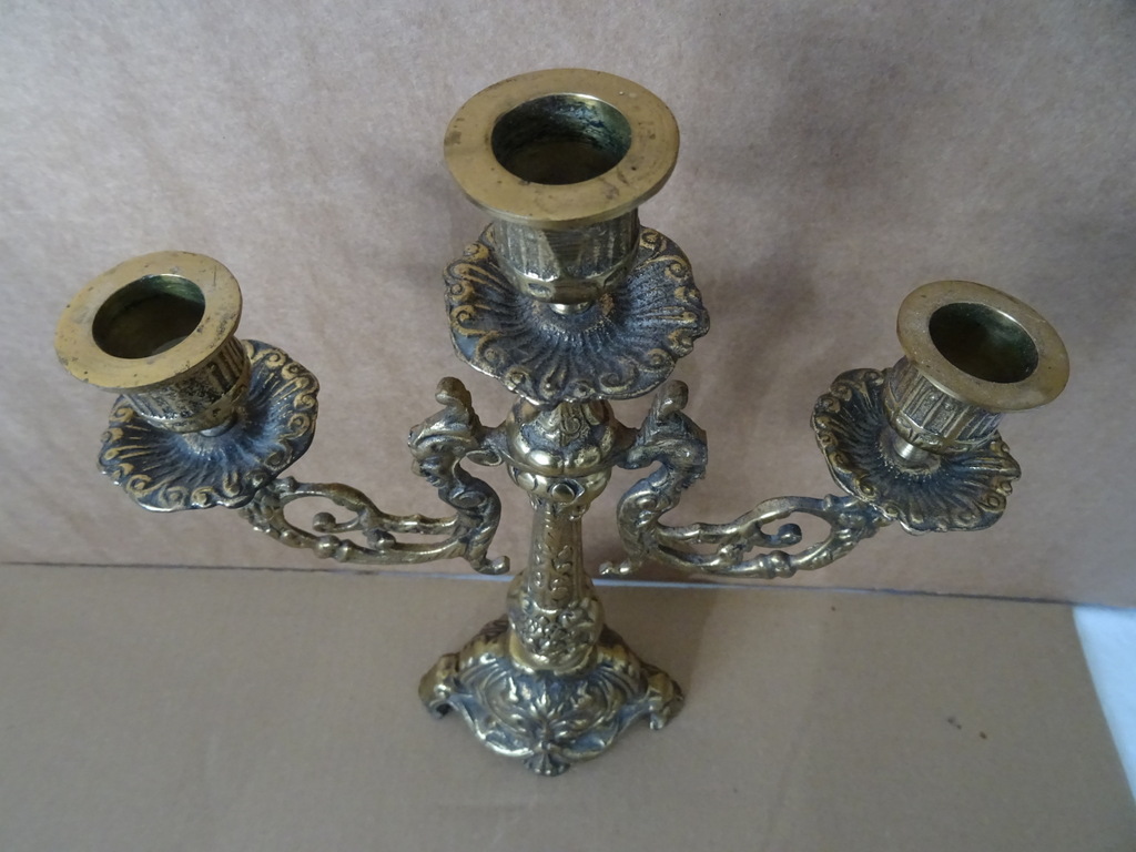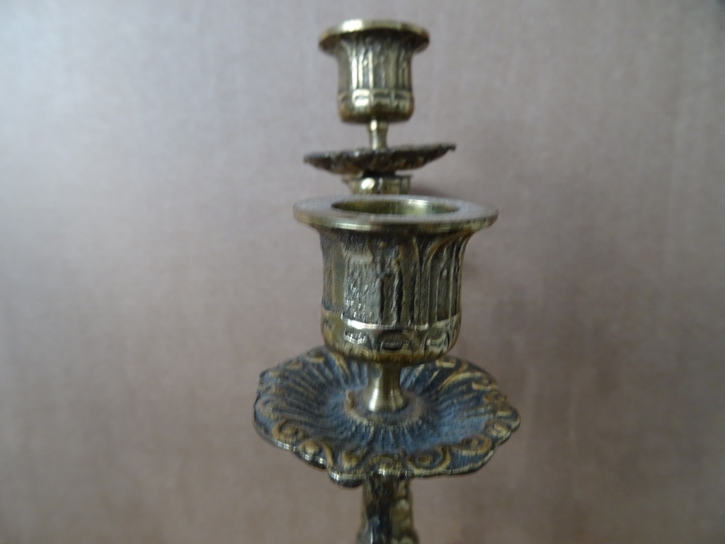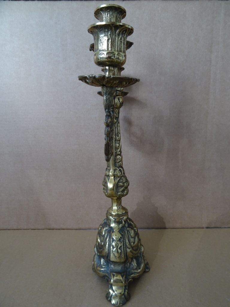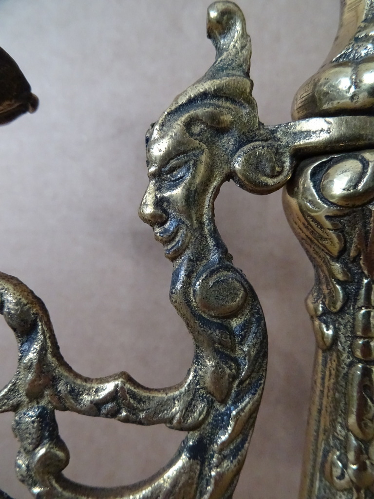 Zware koperen kandelaar met griffioenen van 34 cm vervaardigd rond 1950 of later. In een schitterende gebruikte staat, zeer solide, ietwat scheef. Versierd met griffioenen of ander fabeldieren (met mensenhoofden).