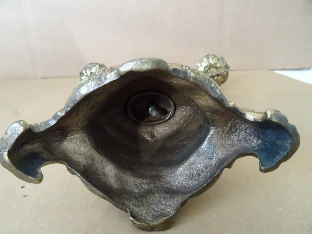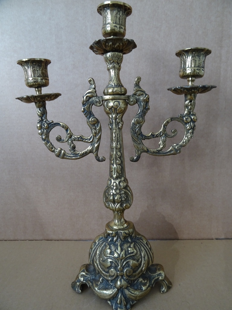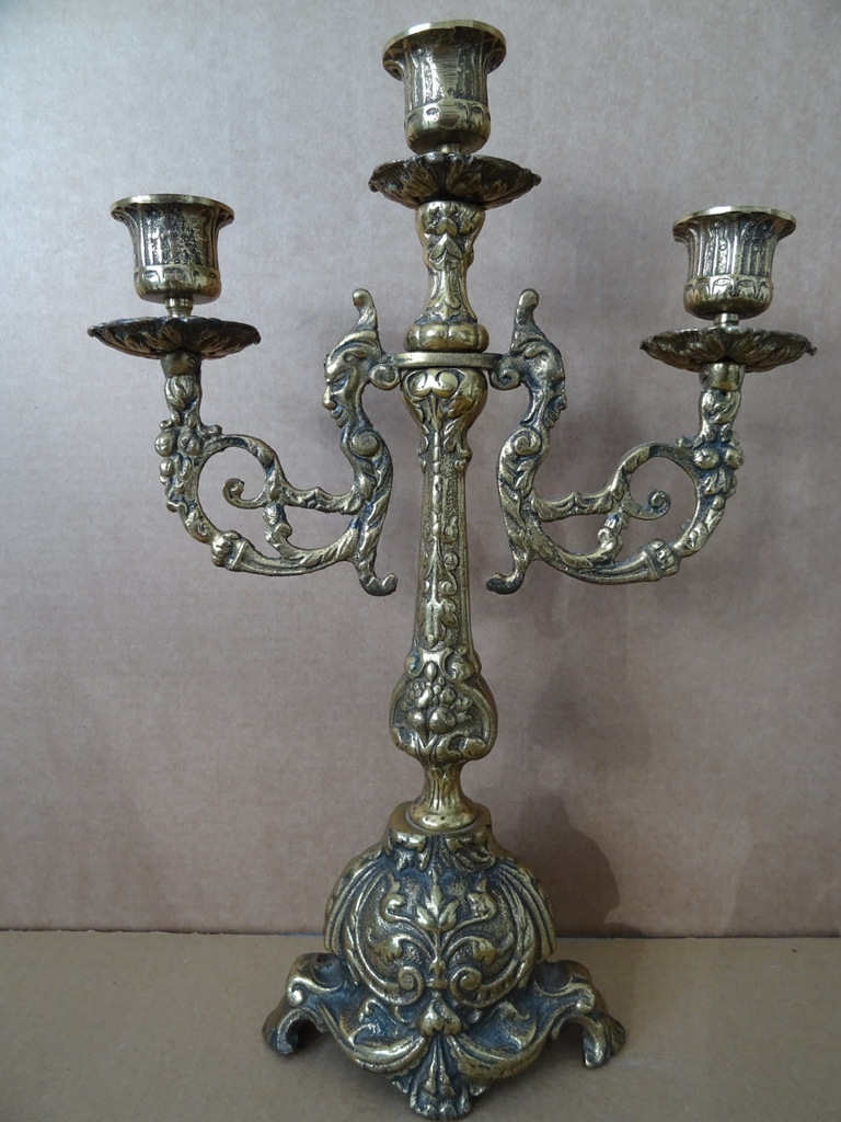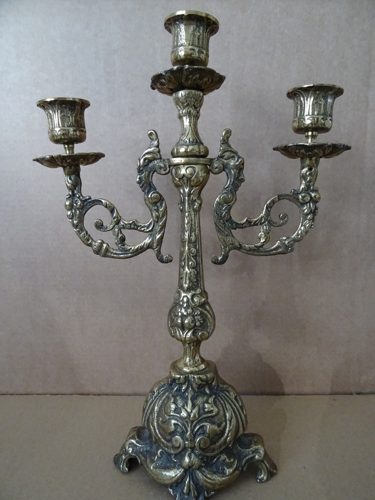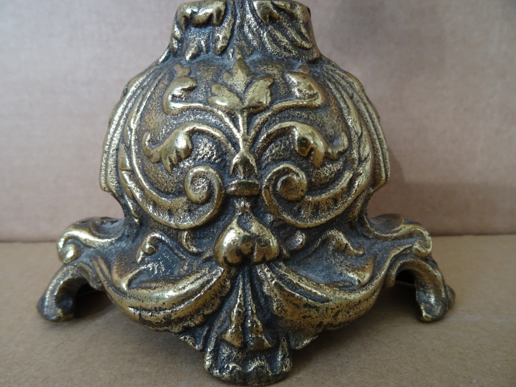 Zware koperen kandelaar met griffioenen van 34 cm vervaardigd rond 1950 of later. In een schitterende gebruikte staat, zeer solide, ietwat scheef. Versierd met griffioenen of ander fabeldieren (met mensenhoofden).