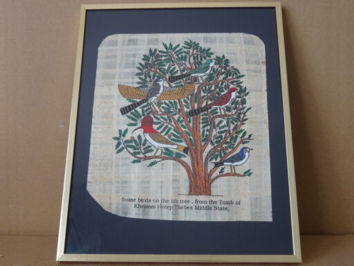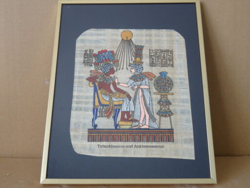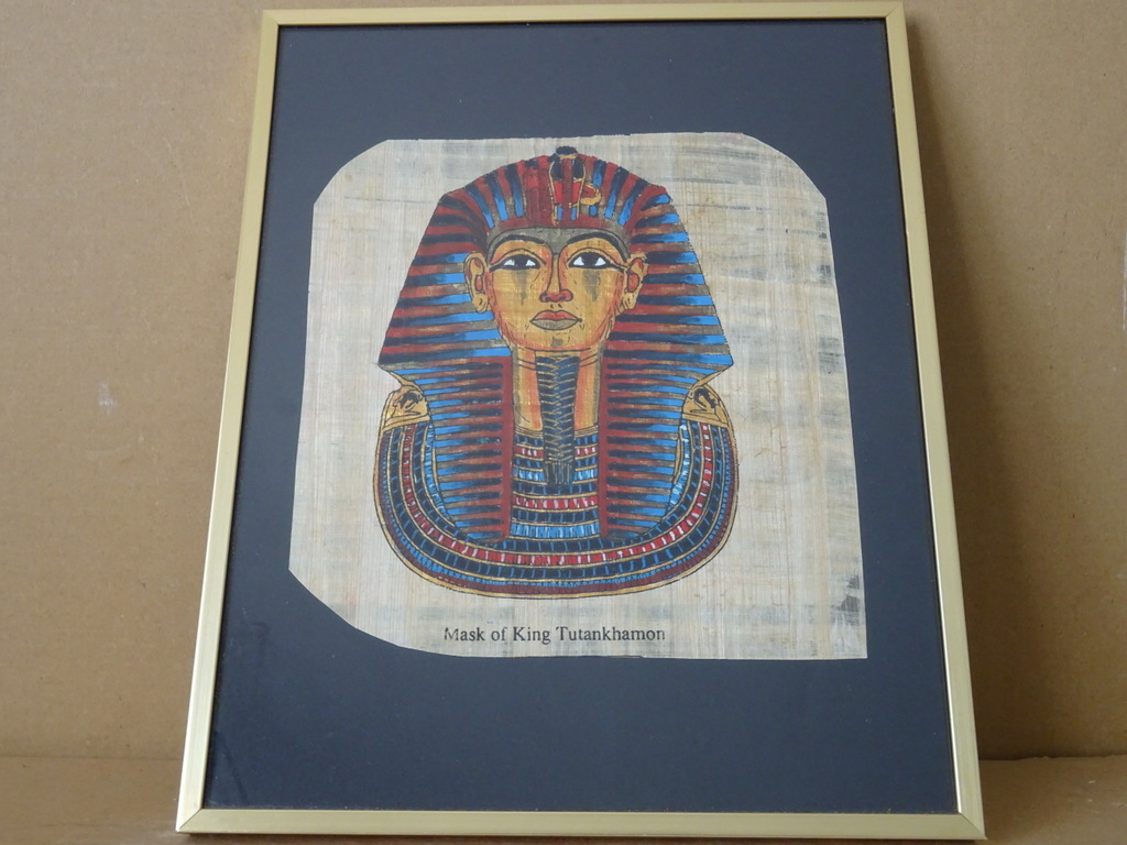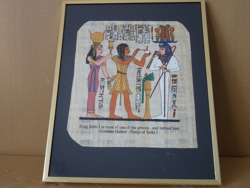 Collectie Egyptische kunst op papyrus geschilderd 25x31cm vervaardigd rond 1980 of wat later. Afgebeeld zijn schitterende Egyptisch taferelen, het zijn ware pronkstukken. Het papyrus is nog in vrij goede staat, van de kunststof lijstjes met glas is er een beschadigd en met wat stof achter het glas. Het glas is nog heel, de lijstjes zijn nog solide. Afmetingen lijsten circa 24,8 bij 31 cm. Er zijn ook nog twee grotere Egyptisch werken op papyrus te koop.