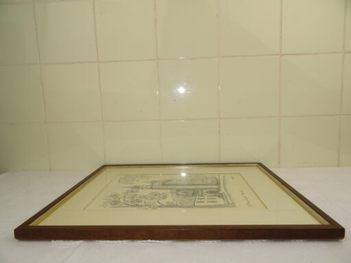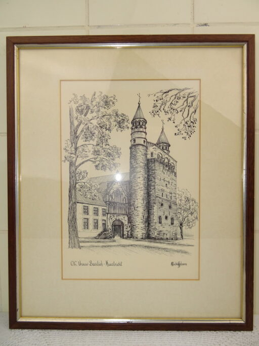 Ingelijste prent of tekening O.L. Vrouw Basiliek Maastricht H Schiffeleers een fraaie afbeelding van de Onze Lieve Vrouw Sterre der Zee in Maastricht. De afbeelding, ik vermoed een tekening, is ingelijst in een geprofileerde houten lijst. Het geheel is in goede staat, de lijst is nog verzegeld aan de achterzijde. De lijst heeft wel enkele minimale krasjes, het passe-partout is wat verkleurd, zie foto`s. Het kunstwerk werd vervaardigd aan het eind van de vorige eeuw.