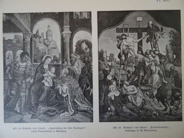 Nederlandsche schilders in Italië in de XVIe eeuw. (De geschiedenis van het romanisme). Platen. zeer zeldzaam. 42 Prachtige platen, genummerd van 1 tot en met 42, afmetingen circa 21,7 bij 17,8 cm. De eerste vijftien platen en de laatste 3 zijn te zien op de foto’s. Zover ik kan nagaan horen deze platen ofwel bij een boek of proefschrift met dezelfde titel van Godefridus Ioannes Hoogewerff ofwel zijn ze in dezelfde periode als het boek uitgebracht (1912). Alle platen zijn in een prachtige gebruikte staat. Het papieren mapje is in redelijke staat, het is wat aan het vergaan, zie foto’s.