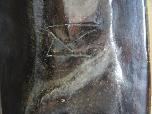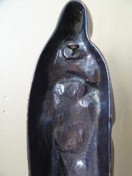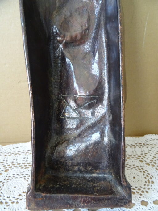 Antiek gietijzeren Mariabeeld 38cm vervaardigd rond 1850 of later. Het prachtige ingetogen beeld toont de Heilige Maria met haar blik omlaag gericht. Ze houdt haar armen kruiselings tegen zich aangedrukt. Verrijk uw interieur of uw collectie met dit pronkstuk van haast tweehonderd jaar oud. Het beeld kan zowel staan als aan de wand hangen. Het is gemerkt aan de achterzijde met een monogram of iets dergelijks, mogelijk Grieks (?), zie foto’s.