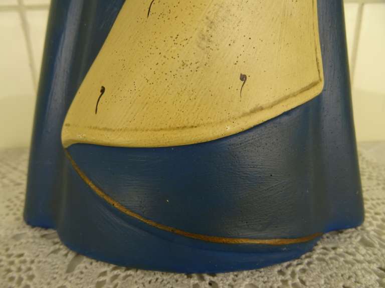 Antiek gipsen Mariabeeld vervaardigd in de eerste helft van de vorige eeuw. Afgebeeld is de Heilige Maria met het kindje Jezus onder haar prachtige blauwe mantel. De herkomst van het beeld is onbekend. Het is slechts gemerkt; S10. Het beeld is nog in vrij goede staat, zie foto’s. Het wiebelt licht maar blijft wel goed staan.